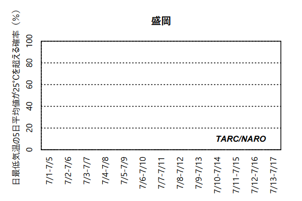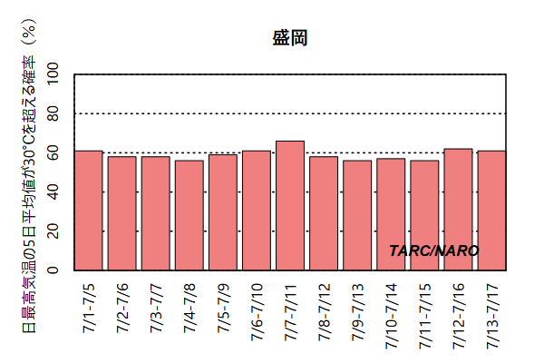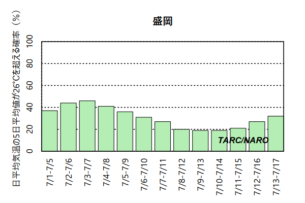 - 棒グラフ(右側)は、日平均気温には水稲の登熟期間の栽培管理の指標となる26℃(参考リンク)を、日最高気温は日中の高温の目安として30℃、日最低気温は夜間の高温の目安として25℃を、それぞれ閾値として、それらの値を超える確率を示しています。