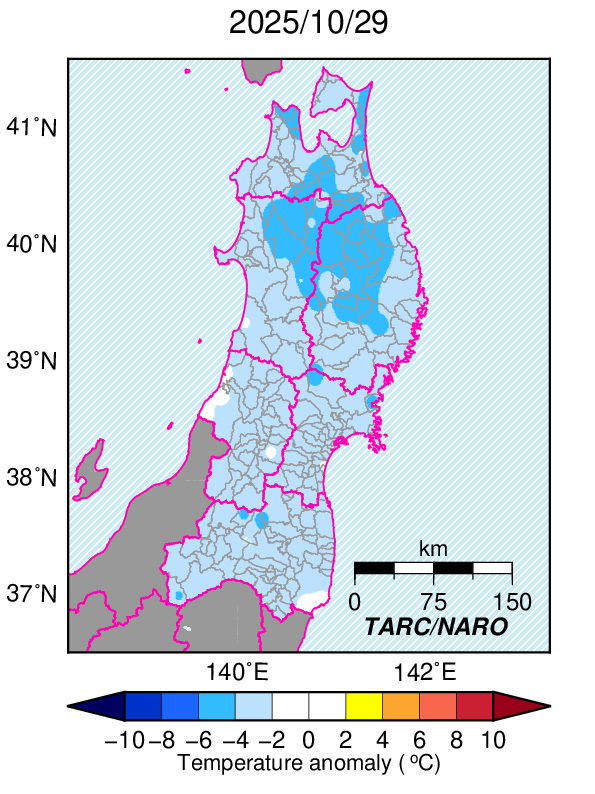 - このページの「日々の寒暖の目安」では、農研機構メッシュ農業気象データの仕様に準じ、1981-2010年の値に基づく平年値を用いています。