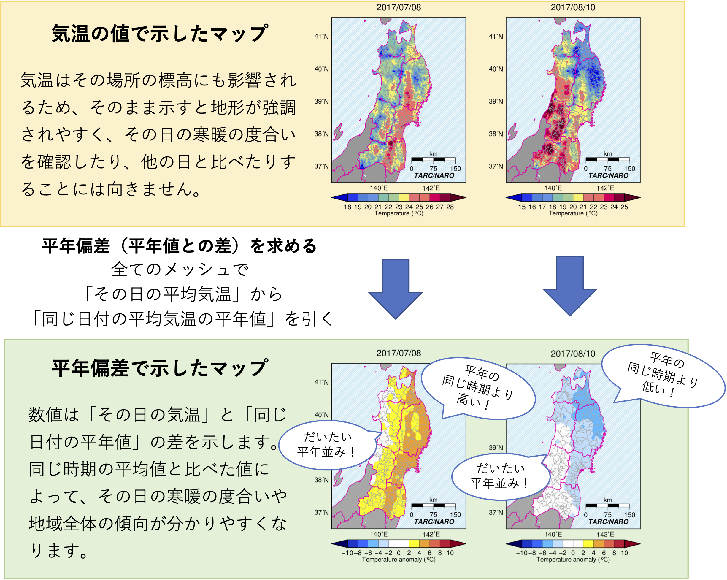 - 「日平均気温」そのものをマップにすると、気温はその場所の標高の影響も受けるために地形が強調された図になりやすく、また日ごとに値が大きく変わるため、その日その日の特徴を把握するには工夫が必要です。