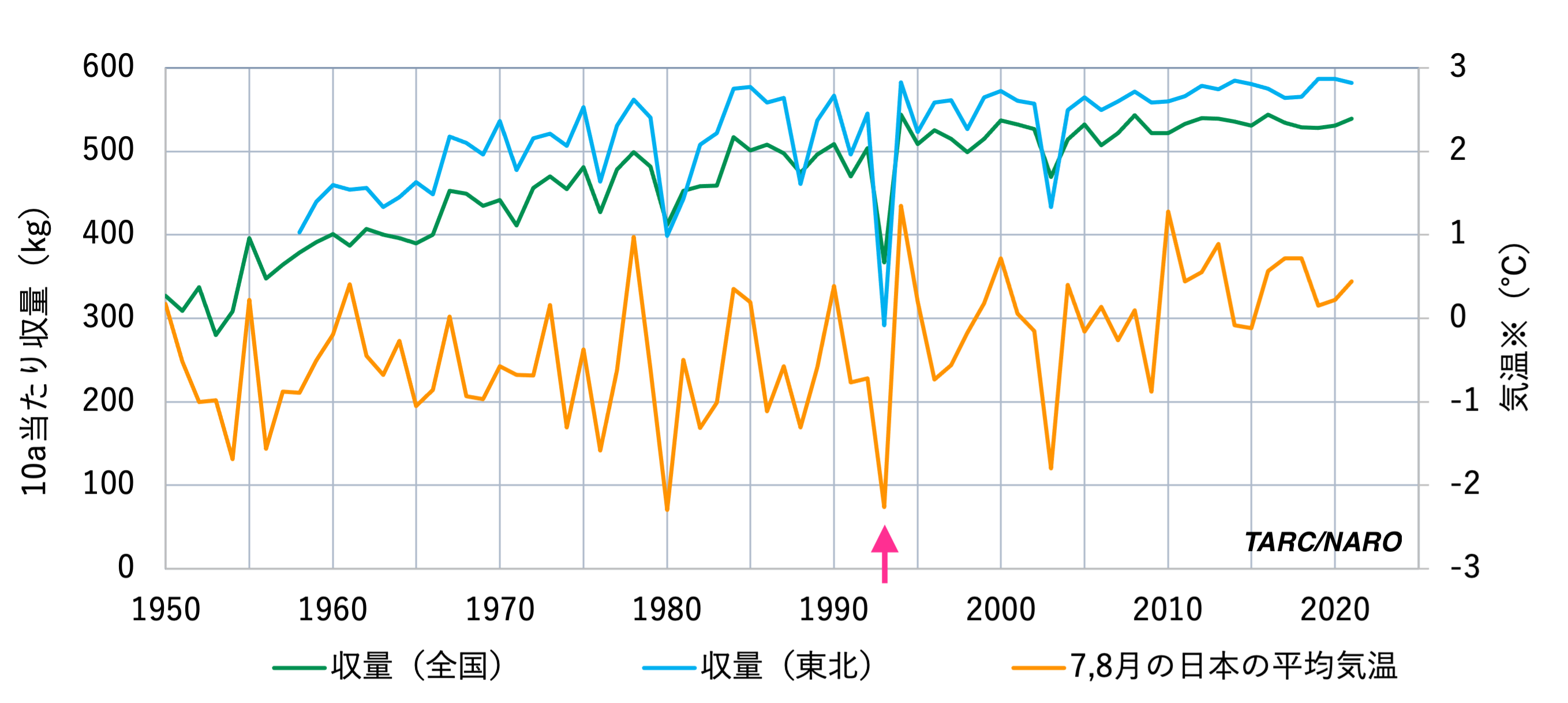 図:国内の水稲反収(10a当たりの収穫量)と平均気温の年次変化
