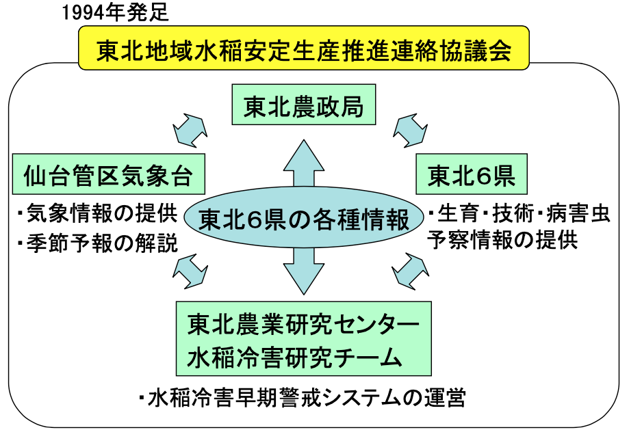 冷害の監視、作柄に関する情報共有のために、東北農政局、仙台管区気象台、東北地域の各県、東北農業試験場(現在の農研機構東北農業研究センター)により「東北地域水稲安定生産推進連絡協議会」が発足。