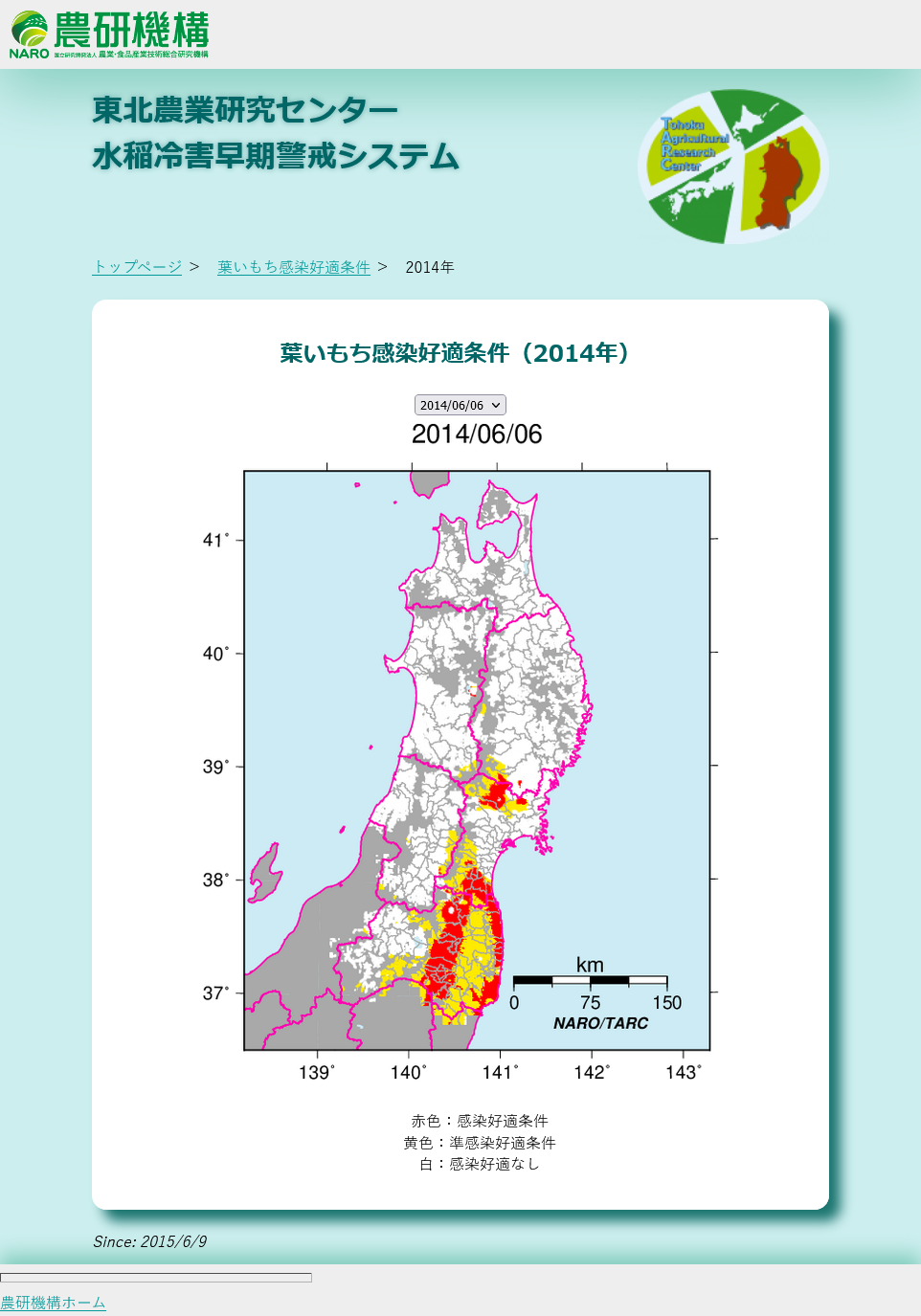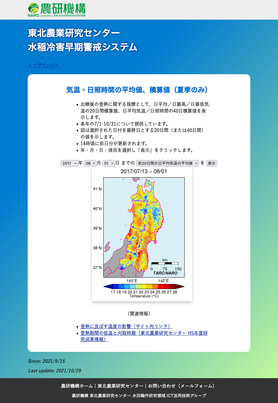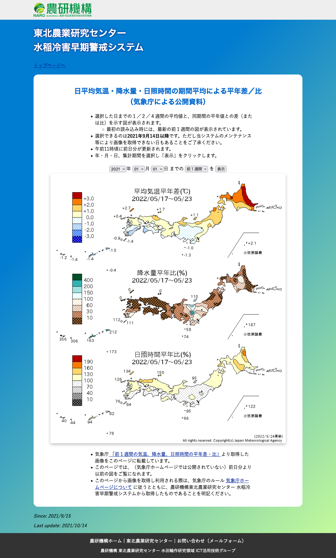更新当初の掲載項目は日平均気温の平年偏差(現在の「見える化」システムでの日々の寒暖の目安マップ)、葉いもち感染好適条件マップ(2020年で終了)の2項目です。 現在の「東北農業気象『見える化』システム」のスタイルの元にもなっています。