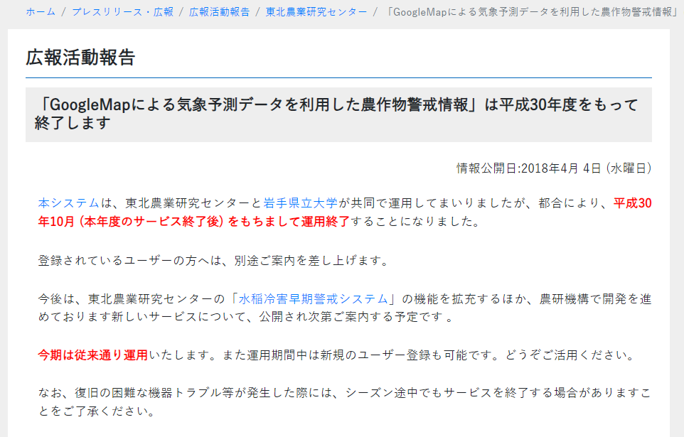 「GoogleMapによる気象予測データを用いた農作物警戒情報」の運用を終了