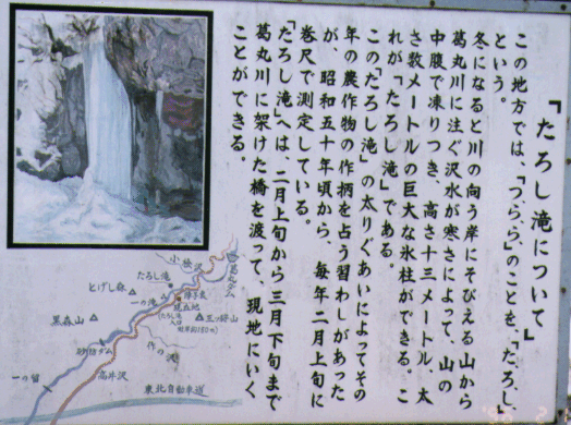 たろし滝は石鳥谷町の中心部から西に山間を8キロ程入った葛丸川上流の景勝「三ツ鞍」,「一ノ滝」の近くにある.トゲシ森から葛丸川に注ぐ沢水が山の中腹で凍りついてできる大氷柱が,この「たろし滝」である.「たろし」とは垂氷(たるひ)が訛ったもので「つらら」のことで,その形が滝に似ていることから「たろし滝」の呼び名がついたといわれている.