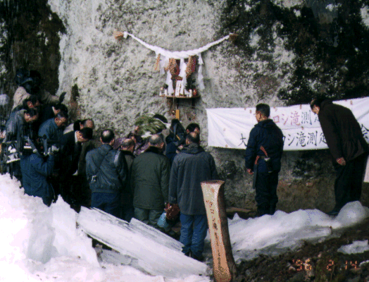 当日,午前10時に託宣が下されると聞き,2月としては気温が異常に高いのを気にしつつ雪道に足を取られながら早めに現場に行く.既に保存会の関係者と宮司さんが神事の準備に取りかかっていた.しかし,氷柱はなく,滝の下に崩落した氷が散乱していた.期待していた「たろし」は幻となってしまった.関係者に聞くと,2月11日までは昨年並みの太さであったが,12,13日の気温の緩みと雨で崩落し,本年は測定不能となったとのこと.10時が近づくについて,地元民やマスコミ関係者がぞくぞくと集まってきた.