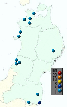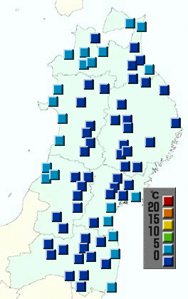 GotoHome Return Prev Next むつ 平均: 1.5℃ 最高: 2.8℃ 最低: -2.4℃ 小田野沢 平均: 0.9℃ 最高: 2.8℃ 最低: -2.8℃ 蟹田 平均: -1.1℃ 最高: 1.6℃ 最低: -2.7℃ 五所川原 平均: 0.5℃ 最高: 2.8℃ 最低: -3.0℃ 青森 平均: 1.6℃ 最高: 4.4℃ 最低: -1.4℃ 六ケ所 平均: -0.8℃ 最高: 1.5℃ 最低: -4.3℃ 鯵ケ沢 平均: 1.8℃ 最高: 4.0℃ 最低: -0.9℃ 弘前 平均: 0.2℃ 最高: 3.1℃ 最低: -3.8℃ 黒石 平均: 0.9℃ 最高: 3.7℃ 最低: -3.5℃ 三沢 平均: -0.3℃ 最高: 2.4℃ 最低: -5.8℃ 十和田 平均: -1.9℃ 最高: 2.2℃ 最低: -11.5℃ 八戸 平均: 0.1℃ 最高: 3.4℃ 最低: -5.1℃ 三戸 平均: -1.7℃ 最高: 3.3℃ 最低: -7.2℃ 能代 平均: 0.1℃ 最高: 3.5℃ 最低: -1.8℃ 大館 平均: -1.2℃ 最高: 0.7℃ 最低: -3.2℃ 鹿角 平均: -2.1℃ 最高: 0.8℃ 最低: -4.3℃ 大潟 平均: 0.8℃ 最高: 2.7℃ 最低: -1.6℃ 阿仁合 平均: -0.5℃ 最高: 1.9℃ 最低: -3.1℃ 秋田 平均: 1.0℃ 最高: 2.9℃ 最低: -1.8℃ 角館 平均: -0.3℃ 最高: 2.2℃ 最低: -2.8℃ 大曲 平均: -0.7℃ 最高: 1.7℃ 最低: -3.1℃ 本荘 平均: 1.2℃ 最高: 3.5℃ 最低: -1.3℃ 横手 平均: -0.3℃ 最高: 1.9℃ 最低: -3.0℃ 湯沢 平均: -0.6℃ 最高: 2.3℃ 最低: -5.0℃ 軽米 平均: -2.2℃ 最高: 2.8℃ 最低: -10.3℃ 久慈 平均: -2.6℃ 最高: 3.9℃ 最低: -8.7℃ 岩手松尾 平均: -4.4℃ 最高: 0.8℃ 最低: -11.3℃ 雫石 平均: -2.8℃ 最高: 0.7℃ 最低: -7.0℃ 盛岡 平均: -1.7℃ 最高: 1.3℃ 最低: -5.3℃ 宮古 平均: -0.2℃ 最高: 5.0℃ 最低: -6.5℃ 紫波 平均: -2.0℃ 最高: 0.7℃ 最低: -5.0℃ 遠野 平均: -2.1℃ 最高: 2.9℃ 最低: -7.2℃ 北上 平均: -1.1℃ 最高: 1.7℃ 最低: -4.8℃ 若柳 平均: -2.2℃ 最高: 2.4℃ 最低: -7.5℃ 江刺 平均: -1.5℃ 最高: 2.8℃ 最低: -6.1℃ 一関 平均: -1.2℃ 最高: 3.0℃ 最低: -6.2℃ 千厩 平均: -2.3℃ 最高: 2.9℃ 最低: -8.1℃ 築舘 平均: -3.0℃ 最高: 2.6℃ 最低: -7.8℃ 米山 平均: -3.7℃ 最高: 0.9℃ 最低: -9.3℃ 古川 平均: -2.9℃ 最高: 0.9℃ 最低: -8.4℃ 大衡 平均: -1.8℃ 最高: 1.9℃ 最低: -6.2℃ 鹿島台 平均: -1.9℃ 最高: 3.0℃ 最低: -9.0℃ 石巻 平均: 0.3℃ 最高: 3.5℃ 最低: -3.4℃ 仙台 平均: 0.8℃ 最高: 3.9℃ 最低: -2.9℃ 白石 平均: -0.9℃ 最高: 3.3℃ 最低: -5.1℃ 亘理 平均: 0.5℃ 最高: 4.2℃ 最低: -3.4℃ 酒田 平均: 1.6℃ 最高: 3.6℃ 最低: -0.3℃ 鶴岡 平均: 2.2℃ 最高: 5.2℃ 最低: -0.5℃ 狩川 平均: 0.8℃ 最高: 2.5℃ 最低: -1.0℃ 新庄 平均: -1.5℃ 最高: 0.9℃ 最低: -3.9℃ 向町 平均: -1.3℃ 最高: 2.0℃ 最低: -4.7℃ 尾花沢 平均: -2.1℃ 最高: 0.2℃ 最低: -5.8℃ 村山 平均: -2.6℃ 最高: 0.9℃ 最低: -7.1℃ 山形 平均: -1.2℃ 最高: 2.2℃ 最低: -4.7℃ 長井 平均: -4.2℃ 最高: -1.3℃ 最低: -8.0℃ 米沢 平均: -3.1℃ 最高: -0.4℃ 最低: -6.2℃ 福島 平均: -0.8℃ 最高: 2.2℃ 最低: -4.0℃ 相馬 平均: 0.5℃ 最高: 4.9℃ 最低: -4.0℃ 喜多方 平均: -3.8℃ 最高: -1.1℃ 最低: -9.7℃ 飯舘 平均: -3.0℃ 最高: 3.4℃ 最低: -11.6℃ 猪苗代 平均: -2.8℃ 最高: 1.3℃ 最低: -8.7℃ 二本松 平均: -1.7℃ 最高: 3.0℃ 最低: -7.3℃ 若松 平均: -3.6℃ 最高: -0.2℃ 最低: -7.1℃ 船引 平均: -2.2℃ 最高: 3.4℃ 最低: -8.9℃ 浪江 平均: 0.6℃ 最高: 6.2℃ 最低: -5.6℃ 郡山 平均: -1.5℃ 最高: 2.6℃ 最低: -5.5℃ 川内 平均: -3.5℃ 最高: 4.0℃ 最低: -12.8℃ 白河 平均: -1.5℃ 最高: 2.7℃ 最低: -7.0℃ 石川 平均: -1.3℃ 最高: 4.0℃ 最低: -6.3℃ 東白川 平均: -2.2℃ 最高: 3.2℃ 最低: -7.9℃ 小名浜 平均: 2.3℃ 最高: 6.5℃ 最低: -3.0℃ むつ : 0.0時間 小田野沢 : 0.0時間 蟹田 : 0.0時間 五所川原 : 0.0時間 青森 : 0.0時間 六ケ所 : 0.0時間 鯵ケ沢 : 0.0時間 弘前 : 0.0時間 黒石 : 0.0時間 三沢 : 0.0時間 十和田 : 0.1時間 八戸 : 0.3時間 三戸 : 0.0時間 能代 : 0.0時間 大館 : 0.0時間 鹿角 : 0.0時間 大潟 : 0.0時間 阿仁合 : 0.0時間 秋田 : 0.0時間 角館 : 0.1時間 大曲 : 0.2時間 本荘 : 0.1時間 横手 : 1.0時間 湯沢 : 1.4時間 軽米 : 0.0時間 久慈 : 0.6時間 岩手松尾 : 0.0時間 雫石 : 0.4時間 盛岡 : 0.2時間 宮古 : 2.6時間 紫波 : 0.7時間 遠野 : 2.5時間 北上 : 1.5時間 若柳 : 1.2時間 江刺 : 2.0時間 一関 : 2.6時間 千厩 : 3.2時間 築舘 : 1.7時間 米山 : 4.2時間 古川 : 3.0時間 大衡 : 1.2時間 鹿島台 : 2.5時間 石巻 : 2.6時間 仙台 : 1.6時間 白石 : 0.7時間 亘理 : 0.8時間 酒田 : 1.0時間 鶴岡 : 0.7時間 狩川 : 0.9時間 新庄 : 1.3時間 向町 : 1.7時間 尾花沢 : 1.7時間 村山 : 0.5時間 山形 : 0.9時間 長井 : 0.3時間 米沢 : 0.4時間 福島 : 0.6時間 相馬 : 0.8時間 喜多方 : 0.6時間 飯舘 : 0.3時間 猪苗代 : 0.4時間 二本松 : 0.0時間 若松 : 0.3時間 船引 : 0.0時間 浪江 : 0.3時間 郡山 : 0.0時間 川内 : 0.3時間 白河 : 欠測 石川 : 0.0時間 東白川 : 0.0時間 小名浜 : 0.2時間 むつ : 0.0mm 小田野沢 : 0.0mm 蟹田 : 1.5mm 五所川原 : 0.5mm 青森 : 0.0mm 六ケ所 : 0.0mm 鯵ケ沢 : 2.5mm 弘前 : 0.5mm 黒石 : 0.0mm 三沢 : 0.0mm 十和田 : 0.0mm 八戸 : 0.0mm 三戸 : 0.0mm 能代 : 3.5mm 大館 : 0.0mm 鹿角 : 0.0mm 大潟 : 3.5mm 阿仁合 : 0.0mm 秋田 : 0.0mm 角館 : 0.0mm 大曲 : 0.0mm 本荘 : 0.0mm 横手 : 0.0mm 湯沢 : 0.0mm 軽米 : 0.0mm 久慈 : 0.0mm 岩手松尾 : 0.0mm 雫石 : 0.0mm 盛岡 : 0.0mm 宮古 : 0.0mm 紫波 : 0.0mm 遠野 : 0.5mm 北上 : 0.0mm 若柳 : 0.0mm 江刺 : 0.0mm 一関 : 0.0mm 千厩 : 0.0mm 築舘 : 0.0mm 米山 : 0.0mm 古川 : 0.0mm 大衡 : 0.0mm 鹿島台 : 0.0mm 石巻 : 0.0mm 仙台 : 0.0mm 白石 : 0.
