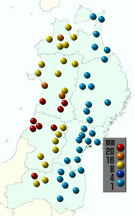 GotoHome Return Prev Next むつ 平均: 1.5℃ 最高: 3.0℃ 最低: -1.4℃ 小田野沢 平均: 1.5℃ 最高: 3.9℃ 最低: -0.8℃ 蟹田 平均: 0.4℃ 最高: 2.6℃ 最低: -2.6℃ 五所川原 平均: 1.0℃ 最高: 3.0℃ 最低: -1.6℃ 青森 平均: 1.2℃ 最高: 3.2℃ 最低: -1.5℃ 六ケ所 平均: 0.6℃ 最高: 2.3℃ 最低: -1.6℃ 鯵ケ沢 平均: 2.1℃ 最高: 4.8℃ 最低: -1.0℃ 弘前 平均: 0.3℃ 最高: 2.2℃ 最低: -1.6℃ 黒石 平均: 0.5℃ 最高: 2.7℃ 最低: -2.5℃ 三沢 平均: 1.2℃ 最高: 3.5℃ 最低: -1.5℃ 十和田 平均: 0.9℃ 最高: 4.5℃ 最低: -1.9℃ 八戸 平均: 1.9℃ 最高: 5.3℃ 最低: -1.3℃ 三戸 平均: 1.0℃ 最高: 5.0℃ 最低: -1.3℃ 能代 平均: 2.8℃ 最高: 5.3℃ 最低: -0.1℃ 大館 平均: 0.0℃ 最高: 1.2℃ 最低: -2.0℃ 鹿角 平均: -0.2℃ 最高: 2.0℃ 最低: -2.6℃ 大潟 平均: 2.6℃ 最高: 5.7℃ 最低: -1.0℃ 阿仁合 平均: 0.1℃ 最高: 1.6℃ 最低: -1.7℃ 秋田 平均: 1.7℃ 最高: 4.4℃ 最低: 0.1℃ 角館 平均: 0.4℃ 最高: 1.2℃ 最低: -1.4℃ 大曲 平均: 0.3℃ 最高: 1.5℃ 最低: -2.2℃ 本荘 平均: 2.2℃ 最高: 6.8℃ 最低: 0.2℃ 横手 平均: 0.5℃ 最高: 2.0℃ 最低: -1.4℃ 湯沢 平均: 0.6℃ 最高: 3.0℃ 最低: -1.0℃ 軽米 平均: 0.7℃ 最高: 4.2℃ 最低: -3.1℃ 久慈 平均: 1.2℃ 最高: 6.4℃ 最低: -3.7℃ 岩手松尾 平均: -0.8℃ 最高: 0.7℃ 最低: -3.2℃ 雫石 平均: -0.4℃ 最高: 3.2℃ 最低: -2.8℃ 盛岡 平均: 0.3℃ 最高: 3.0℃ 最低: -1.4℃ 宮古 平均: 3.6℃ 最高: 8.8℃ 最低: -0.7℃ 紫波 平均: 0.0℃ 最高: 3.3℃ 最低: -1.9℃ 遠野 平均: -0.7℃ 最高: 3.7℃ 最低: -3.5℃ 北上 平均: 0.4℃ 最高: 3.5℃ 最低: -1.6℃ 若柳 平均: -0.3℃ 最高: 3.3℃ 最低: -4.5℃ 江刺 平均: -0.1℃ 最高: 3.6℃ 最低: -3.4℃ 一関 平均: 0.3℃ 最高: 3.6℃ 最低: -3.2℃ 千厩 平均: 0.0℃ 最高: 4.2℃ 最低: -4.3℃ 築舘 平均: -0.7℃ 最高: 3.4℃ 最低: -6.5℃ 米山 平均: -1.6℃ 最高: 1.7℃ 最低: -8.3℃ 古川 平均: -0.8℃ 最高: 3.0℃ 最低: -7.2℃ 大衡 平均: 0.6℃ 最高: 3.9℃ 最低: -4.9℃ 鹿島台 平均: -0.6℃ 最高: 3.3℃ 最低: -6.0℃ 石巻 平均: 0.6℃ 最高: 2.8℃ 最低: -2.7℃ 仙台 平均: 2.5℃ 最高: 6.1℃ 最低: -0.7℃ 白石 平均: 2.5℃ 最高: 8.0℃ 最低: -1.5℃ 亘理 平均: 2.9℃ 最高: 9.6℃ 最低: -1.5℃ 酒田 平均: 2.5℃ 最高: 5.1℃ 最低: 0.7℃ 鶴岡 平均: 2.5℃ 最高: 5.2℃ 最低: 0.4℃ 狩川 平均: 0.9℃ 最高: 2.7℃ 最低: 0.0℃ 新庄 平均: 0.0℃ 最高: 1.1℃ 最低: -1.3℃ 向町 平均: -0.2℃ 最高: 1.2℃ 最低: -1.7℃ 尾花沢 平均: -0.7℃ 最高: 1.0℃ 最低: -5.0℃ 村山 平均: -0.4℃ 最高: 1.9℃ 最低: -4.4℃ 山形 平均: -0.1℃ 最高: 1.1℃ 最低: -1.5℃ 長井 平均: -1.1℃ 最高: 0.9℃ 最低: -4.2℃ 米沢 平均: -0.2℃ 最高: 2.6℃ 最低: -4.9℃ 福島 平均: 1.8℃ 最高: 8.8℃ 最低: -2.2℃ 相馬 平均: 2.5℃ 最高: 10.0℃ 最低: -3.1℃ 喜多方 平均: -1.3℃ 最高: 0.7℃ 最低: -4.6℃ 飯舘 平均: 1.3℃ 最高: 7.3℃ 最低: -5.1℃ 猪苗代 平均: -0.8℃ 最高: 3.1℃ 最低: -5.1℃ 二本松 平均: 3.0℃ 最高: 9.5℃ 最低: -2.8℃ 若松 平均: -1.3℃ 最高: 2.8℃ 最低: -5.9℃ 船引 平均: 1.3℃ 最高: 6.8℃ 最低: -3.6℃ 浪江 平均: 4.8℃ 最高: 12.0℃ 最低: -0.8℃ 郡山 平均: 2.0℃ 最高: 8.9℃ 最低: -3.1℃ 川内 平均: 1.5℃ 最高: 8.7℃ 最低: -3.5℃ 白河 平均: 1.7℃ 最高: 9.3℃ 最低: -3.6℃ 石川 平均: 2.3℃ 最高: 9.2℃ 最低: -0.9℃ 東白川 平均: 2.2℃ 最高: 7.5℃ 最低: -0.6℃ 小名浜 平均: 6.1℃ 最高: 11.7℃ 最低: 1.1℃ むつ : 1.9時間 小田野沢 : 1.5時間 蟹田 : 2.3時間 五所川原 : 0.0時間 青森 : 0.0時間 六ケ所 : 0.1時間 鯵ケ沢 : 0.0時間 弘前 : 0.0時間 黒石 : 0.0時間 三沢 : 0.9時間 十和田 : 1.3時間 八戸 : 2.6時間 三戸 : 1.7時間 能代 : 0.0時間 大館 : 0.0時間 鹿角 : 0.0時間 大潟 : 0.0時間 阿仁合 : 0.0時間 秋田 : 0.0時間 角館 : 0.0時間 大曲 : 0.0時間 本荘 : 0.0時間 横手 : 0.0時間 湯沢 : 0.0時間 軽米 : 2.1時間 久慈 : 1.3時間 岩手松尾 : 0.0時間 雫石 : 1.0時間 盛岡 : 1.1時間 宮古 : 1.6時間 紫波 : 0.8時間 遠野 : 1.0時間 北上 : 0.6時間 若柳 : 0.5時間 江刺 : 0.5時間 一関 : 0.7時間 千厩 : 0.8時間 築舘 : 0.0時間 米山 : 0.0時間 古川 : 0.0時間 大衡 : 0.0時間 鹿島台 : 0.0時間 石巻 : 0.2時間 仙台 : 0.5時間 白石 : 2.0時間 亘理 : 1.2時間 酒田 : 0.0時間 鶴岡 : 0.0時間 狩川 : 0.0時間 新庄 : 0.0時間 向町 : 0.0時間 尾花沢 : 0.0時間 村山 : 0.0時間 山形 : 0.0時間 長井 : 0.0時間 米沢 : 0.1時間 福島 : 3.9時間 相馬 : 2.4時間 喜多方 : 0.1時間 飯舘 : 2.5時間 猪苗代 : 0.2時間 二本松 : 4.4時間 若松 : 0.5時間 船引 : 3.4時間 浪江 : 5.4時間 郡山 : 3.4時間 川内 : 5.3時間 白河 : 欠測 石川 : 4.8時間 東白川 : 4.1時間 小名浜 : 7.6時間 むつ : 1.0mm 小田野沢 : 0.5mm 蟹田 : 8.0mm 五所川原 : 17.5mm 青森 : 8.0mm 六ケ所 : 1.5mm 鯵ケ沢 : 14.5mm 弘前 : 13.0mm 黒石 : 9.0mm 三沢 : 0.0mm 十和田 : 1.0mm 八戸 : 0.5mm 三戸 : 0.0mm 能代 : 8.0mm 大館 : 10.0mm 鹿角 : 10.0mm 大潟 : 11.0mm 阿仁合 : 15.5mm 秋田 : 17.5mm 角館 : 13.5mm 大曲 : 16.0mm 本荘 : 22.0mm 横手 : 21.5mm 湯沢 : 25.0mm 軽米 : 0.5mm 久慈 : 0.0mm 岩手松尾 : 3.0mm 雫石 : 1.5mm 盛岡 : 0.5mm 宮古 : 0.0mm 紫波 : 0.0mm 遠野 : 0.5mm 北上 : 1.5mm 若柳 : 1.5mm 江刺 : 0.0mm 一関 : 2.5mm 千厩 : 0.0mm 築舘 : 0.5mm 米山 : 3.5mm 古川 : 2.0mm 大衡 : 3.0mm 鹿島台 : 2.0mm 石巻 : 2.0mm 仙台 : 2.5mm 白石 : 3.0mm 亘理 : 0.5mm 酒田 : 41