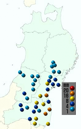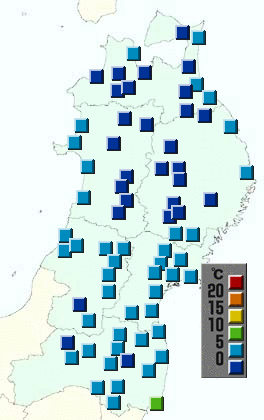 GotoHome Return Prev Next むつ 平均: -0.8℃ 最高: 2.7℃ 最低: -7.7℃ 小田野沢 平均: 0.0℃ 最高: 3.3℃ 最低: -6.2℃ 蟹田 平均: 0.0℃ 最高: 3.5℃ 最低: -8.8℃ 五所川原 平均: -2.9℃ 最高: 3.4℃ 最低: -10.5℃ 青森 平均: -0.7℃ 最高: 4.1℃ 最低: -7.6℃ 六ケ所 平均: -0.7℃ 最高: 2.4℃ 最低: -5.9℃ 鯵ケ沢 平均: -0.2℃ 最高: 3.2℃ 最低: -5.7℃ 弘前 平均: -1.6℃ 最高: 3.5℃ 最低: -8.7℃ 黒石 平均: -3.3℃ 最高: 4.0℃ 最低: -9.8℃ 三沢 平均: 0.0℃ 最高: 4.1℃ 最低: -5.4℃ 十和田 平均: -1.5℃ 最高: 3.5℃ 最低: -8.8℃ 八戸 平均: 0.2℃ 最高: 4.1℃ 最低: -4.8℃ 三戸 平均: -1.7℃ 最高: 5.0℃ 最低: -9.6℃ 能代 平均: 0.9℃ 最高: 4.3℃ 最低: -3.1℃ 大館 平均: -1.4℃ 最高: 4.2℃ 最低: -8.2℃ 鹿角 平均: -3.3℃ 最高: 3.3℃ 最低: -12.7℃ 大潟 平均: 0.0℃ 最高: 3.8℃ 最低: -6.5℃ 阿仁合 平均: -2.7℃ 最高: 3.3℃ 最低: -8.3℃ 秋田 平均: 1.0℃ 最高: 4.0℃ 最低: -3.4℃ 角館 平均: -0.7℃ 最高: 4.2℃ 最低: -7.5℃ 大曲 平均: -1.5℃ 最高: 3.3℃ 最低: -9.1℃ 本荘 平均: 1.6℃ 最高: 4.0℃ 最低: -1.8℃ 横手 平均: -0.2℃ 最高: 3.6℃ 最低: -6.7℃ 湯沢 平均: -0.4℃ 最高: 2.8℃ 最低: -4.7℃ 軽米 平均: -2.5℃ 最高: 2.4℃ 最低: -10.6℃ 久慈 平均: 0.6℃ 最高: 3.7℃ 最低: -4.1℃ 岩手松尾 平均: -3.9℃ 最高: 1.9℃ 最低: -10.9℃ 雫石 平均: -3.3℃ 最高: 1.5℃ 最低: -9.9℃ 盛岡 平均: -1.7℃ 最高: 1.6℃ 最低: -5.4℃ 宮古 平均: 1.9℃ 最高: 3.7℃ 最低: -1.1℃ 紫波 平均: -2.4℃ 最高: 1.8℃ 最低: -5.3℃ 遠野 平均: -1.0℃ 最高: 1.8℃ 最低: -5.6℃ 北上 平均: -0.9℃ 最高: 1.6℃ 最低: -2.6℃ 若柳 平均: -1.0℃ 最高: 0.6℃ 最低: -2.1℃ 江刺 平均: -1.0℃ 最高: 1.4℃ 最低: -2.7℃ 一関 平均: 0.7℃ 最高: 2.9℃ 最低: -0.5℃ 千厩 平均: 1.0℃ 最高: 3.6℃ 最低: -1.5℃ 築舘 平均: 0.5℃ 最高: 3.4℃ 最低: -1.8℃ 米山 平均: 0.3℃ 最高: 4.6℃ 最低: -4.1℃ 古川 平均: 0.1℃ 最高: 2.3℃ 最低: -3.5℃ 大衡 平均: 0.3℃ 最高: 2.5℃ 最低: -1.7℃ 鹿島台 平均: 0.5℃ 最高: 3.1℃ 最低: -2.7℃ 石巻 平均: 2.0℃ 最高: 4.6℃ 最低: -1.2℃ 仙台 平均: 1.3℃ 最高: 2.6℃ 最低: 0.6℃ 白石 平均: 0.6℃ 最高: 1.9℃ 最低: -0.8℃ 亘理 平均: 1.3℃ 最高: 2.1℃ 最低: 0.6℃ 酒田 平均: 3.0℃ 最高: 4.7℃ 最低: -0.7℃ 鶴岡 平均: 2.4℃ 最高: 4.5℃ 最低: -1.5℃ 狩川 平均: 2.2℃ 最高: 3.4℃ 最低: 0.7℃ 新庄 平均: 0.5℃ 最高: 2.5℃ 最低: -2.6℃ 向町 平均: 0.3℃ 最高: 1.8℃ 最低: -2.3℃ 尾花沢 平均: 0.0℃ 最高: 2.3℃ 最低: -5.7℃ 村山 平均: 0.3℃ 最高: 2.2℃ 最低: -1.7℃ 山形 平均: 0.2℃ 最高: 1.0℃ 最低: -0.7℃ 長井 平均: -0.8℃ 最高: 1.0℃ 最低: -2.7℃ 米沢 平均: 0.4℃ 最高: 1.6℃ 最低: -1.4℃ 福島 平均: 0.9℃ 最高: 1.6℃ 最低: 0.3℃ 相馬 平均: 2.3℃ 最高: 5.4℃ 最低: 1.1℃ 喜多方 平均: -0.7℃ 最高: 2.2℃ 最低: -4.7℃ 飯舘 平均: 0.0℃ 最高: 1.1℃ 最低: -2.4℃ 猪苗代 平均: 0.3℃ 最高: 1.7℃ 最低: -2.8℃ 二本松 平均: 0.4℃ 最高: 0.9℃ 最低: -0.3℃ 若松 平均: 0.0℃ 最高: 3.6℃ 最低: -3.2℃ 船引 平均: -0.2℃ 最高: 1.3℃ 最低: -1.2℃ 浪江 平均: 2.8℃ 最高: 5.8℃ 最低: 1.7℃ 郡山 平均: 0.7℃ 最高: 1.6℃ 最低: 0.0℃ 川内 平均: 0.2℃ 最高: 1.5℃ 最低: -1.6℃ 白河 平均: 0.3℃ 最高: 0.8℃ 最低: -0.4℃ 石川 平均: 0.3℃ 最高: 1.9℃ 最低: -1.1℃ 東白川 平均: 0.9℃ 最高: 2.1℃ 最低: 0.0℃ 小名浜 平均: 5.1℃ 最高: 7.5℃ 最低: 3.3℃ むつ : 1.9時間 小田野沢 : 1.1時間 蟹田 : 6.6時間 五所川原 : 7.0時間 青森 : 7.7時間 六ケ所 : 1.0時間 鯵ケ沢 : 8.0時間 弘前 : 7.0時間 黒石 : 7.9時間 三沢 : 1.0時間 十和田 : 2.9時間 八戸 : 2.2時間 三戸 : 4.1時間 能代 : 7.0時間 大館 : 5.7時間 鹿角 : 7.1時間 大潟 : 6.7時間 阿仁合 : 5.8時間 秋田 : 4.8時間 角館 : 3.4時間 大曲 : 2.8時間 本荘 : 2.1時間 横手 : 3.1時間 湯沢 : 2.4時間 軽米 : 5.1時間 久慈 : 2.1時間 岩手松尾 : 2.1時間 雫石 : 1.1時間 盛岡 : 0.2時間 宮古 : 1.1時間 紫波 : 1.2時間 遠野 : 0.0時間 北上 : 0.0時間 若柳 : 0.0時間 江刺 : 0.0時間 一関 : 0.0時間 千厩 : 0.0時間 築舘 : 0.0時間 米山 : 0.0時間 古川 : 0.0時間 大衡 : 0.0時間 鹿島台 : 0.0時間 石巻 : 0.0時間 仙台 : 0.0時間 白石 : 0.0時間 亘理 : 0.0時間 酒田 : 1.7時間 鶴岡 : 2.3時間 狩川 : 2.3時間 新庄 : 0.3時間 向町 : 0.0時間 尾花沢 : 0.2時間 村山 : 0.0時間 山形 : 0.0時間 長井 : 0.0時間 米沢 : 0.0時間 福島 : 0.0時間 相馬 : 0.0時間 喜多方 : 0.0時間 飯舘 : 0.0時間 猪苗代 : 0.0時間 二本松 : 0.0時間 若松 : 0.0時間 船引 : 0.0時間 浪江 : 0.0時間 郡山 : 0.0時間 川内 : 0.0時間 白河 : 0.0時間 石川 : 0.0時間 東白川 : 0.0時間 小名浜 : 0.0時間 むつ : 0.0mm 小田野沢 : 0.0mm 蟹田 : 0.0mm 五所川原 : 0.0mm 青森 : 0.0mm 六ケ所 : 0.0mm 鯵ケ沢 : 0.0mm 弘前 : 0.0mm 黒石 : 0.0mm 三沢 : 0.0mm 十和田 : 0.0mm 八戸 : 0.0mm 三戸 : 0.0mm 能代 : 0.0mm 大館 : 0.0mm 鹿角 : 0.0mm 大潟 : 0.0mm 阿仁合 : 0.0mm 秋田 : 0.0mm 角館 : 0.0mm 大曲 : 0.0mm 本荘 : 0.0mm 横手 : 0.0mm 湯沢 : 0.0mm 軽米 : 0.0mm 久慈 : 0.0mm 岩手松尾 : 0.0mm 雫石 : 0.0mm 盛岡 : 0.0mm 宮古 : 0.0mm 紫波 : 0.0mm 遠野 : 0.0mm 北上 : 0.5mm 若柳 : 2.5mm 江刺 : 2.0mm 一関 : 2.5mm 千厩 : 3.0mm 築舘 : 2.5mm 米山 : 4.5mm 古川 : 4.0mm 大衡 : 9.0mm 鹿島台 : 6.0mm 石巻 : 7.0mm 仙台 : 7.5mm 白石 : 13.0mm 亘理 : 17.0mm 酒田 : 0.5