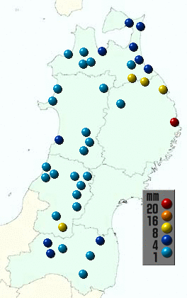 GotoHome Return Prev Next むつ 平均: 0.3℃ 最高: 1.3℃ 最低: -0.9℃ 小田野沢 平均: 0.1℃ 最高: 1.2℃ 最低: -1.0℃ 蟹田 平均: 0.7℃ 最高: 2.4℃ 最低: -0.2℃ 五所川原 平均: -0.2℃ 最高: 2.3℃ 最低: -2.0℃ 青森 平均: 0.3℃ 最高: 1.5℃ 最低: -1.0℃ 六ケ所 平均: -0.6℃ 最高: 0.4℃ 最低: -1.8℃ 鯵ケ沢 平均: 0.0℃ 最高: 1.8℃ 最低: -1.3℃ 弘前 平均: 0.0℃ 最高: 2.1℃ 最低: -1.5℃ 黒石 平均: -0.4℃ 最高: 1.3℃ 最低: -1.6℃ 三沢 平均: 0.1℃ 最高: 1.1℃ 最低: -0.9℃ 十和田 平均: -0.4℃ 最高: 0.6℃ 最低: -1.5℃ 八戸 平均: 0.5℃ 最高: 1.1℃ 最低: -0.2℃ 三戸 平均: -0.1℃ 最高: 1.2℃ 最低: -1.0℃ 能代 平均: 0.6℃ 最高: 2.8℃ 最低: -1.2℃ 大館 平均: 0.0℃ 最高: 1.8℃ 最低: -1.5℃ 鹿角 平均: -0.8℃ 最高: 1.3℃ 最低: -2.0℃ 大潟 平均: 0.4℃ 最高: 2.4℃ 最低: -1.0℃ 阿仁合 平均: -0.5℃ 最高: 1.3℃ 最低: -1.8℃ 秋田 平均: 0.9℃ 最高: 2.8℃ 最低: -0.8℃ 角館 平均: 0.1℃ 最高: 2.6℃ 最低: -1.5℃ 大曲 平均: 0.2℃ 最高: 2.4℃ 最低: -1.3℃ 本荘 平均: 0.9℃ 最高: 4.1℃ 最低: -1.4℃ 横手 平均: 0.5℃ 最高: 3.0℃ 最低: -1.2℃ 湯沢 平均: 0.4℃ 最高: 2.1℃ 最低: -1.2℃ 軽米 平均: -1.3℃ 最高: -0.3℃ 最低: -1.8℃ 久慈 平均: 0.2℃ 最高: 1.1℃ 最低: -0.4℃ 岩手松尾 平均: -1.2℃ 最高: 1.1℃ 最低: -2.9℃ 雫石 平均: 0.4℃ 最高: 3.7℃ 最低: -2.8℃ 盛岡 平均: -0.1℃ 最高: 1.9℃ 最低: -1.3℃ 宮古 平均: 0.4℃ 最高: 1.7℃ 最低: -0.4℃ 紫波 平均: -0.3℃ 最高: 1.5℃ 最低: -1.5℃ 遠野 平均: -0.6℃ 最高: 1.7℃ 最低: -5.2℃ 北上 平均: 1.4℃ 最高: 2.9℃ 最低: -1.2℃ 若柳 平均: 1.1℃ 最高: 2.8℃ 最低: -2.2℃ 江刺 平均: 1.1℃ 最高: 2.9℃ 最低: -2.4℃ 一関 平均: 2.2℃ 最高: 4.3℃ 最低: -1.0℃ 千厩 平均: 0.9℃ 最高: 3.1℃ 最低: -2.5℃ 築舘 平均: 1.9℃ 最高: 3.8℃ 最低: -2.2℃ 米山 平均: 1.7℃ 最高: 4.2℃ 最低: -1.6℃ 古川 平均: 1.2℃ 最高: 3.5℃ 最低: -1.4℃ 大衡 平均: 1.8℃ 最高: 2.9℃ 最低: 0.2℃ 鹿島台 平均: 1.1℃ 最高: 3.5℃ 最低: -2.1℃ 石巻 平均: 1.2℃ 最高: 3.5℃ 最低: 0.0℃ 仙台 平均: 2.7℃ 最高: 4.6℃ 最低: 1.0℃ 白石 平均: 1.8℃ 最高: 4.7℃ 最低: 0.0℃ 亘理 平均: 2.4℃ 最高: 5.0℃ 最低: 0.9℃ 酒田 平均: 3.1℃ 最高: 5.7℃ 最低: 0.3℃ 鶴岡 平均: 2.4℃ 最高: 4.5℃ 最低: 0.2℃ 狩川 平均: 1.4℃ 最高: 3.2℃ 最低: -0.6℃ 新庄 平均: 0.5℃ 最高: 3.1℃ 最低: -0.9℃ 向町 平均: 0.2℃ 最高: 1.6℃ 最低: -1.1℃ 尾花沢 平均: 0.8℃ 最高: 2.6℃ 最低: -0.5℃ 村山 平均: 0.7℃ 最高: 3.6℃ 最低: -0.4℃ 山形 平均: 0.7℃ 最高: 2.9℃ 最低: -0.8℃ 長井 平均: 0.3℃ 最高: 2.8℃ 最低: -1.5℃ 米沢 平均: 1.3℃ 最高: 2.7℃ 最低: -0.4℃ 福島 平均: 2.8℃ 最高: 4.5℃ 最低: 0.7℃ 相馬 平均: 2.8℃ 最高: 4.8℃ 最低: 0.5℃ 喜多方 平均: 0.8℃ 最高: 3.1℃ 最低: -0.9℃ 飯舘 平均: -0.4℃ 最高: 1.2℃ 最低: -1.8℃ 猪苗代 平均: -0.8℃ 最高: 0.3℃ 最低: -2.2℃ 二本松 平均: 0.6℃ 最高: 3.0℃ 最低: -1.5℃ 若松 平均: 1.5℃ 最高: 3.1℃ 最低: -0.1℃ 船引 平均: -0.6℃ 最高: 1.2℃ 最低: -1.8℃ 浪江 平均: 3.0℃ 最高: 5.7℃ 最低: 0.5℃ 郡山 平均: 1.8℃ 最高: 4.0℃ 最低: -0.3℃ 川内 平均: -0.5℃ 最高: 1.7℃ 最低: -2.5℃ 白河 平均: 1.2℃ 最高: 3.4℃ 最低: -0.9℃ 石川 平均: 1.1℃ 最高: 3.1℃ 最低: -0.8℃ 東白川 平均: 1.1℃ 最高: 4.3℃ 最低: -2.1℃ 小名浜 平均: 4.3℃ 最高: 6.7℃ 最低: 2.5℃ むつ : 0.0時間 小田野沢 : 0.0時間 蟹田 : 0.2時間 五所川原 : 2.2時間 青森 : 0.3時間 六ケ所 : 1.0時間 鯵ケ沢 : 1.2時間 弘前 : 1.7時間 黒石 : 1.5時間 三沢 : 0.0時間 十和田 : 0.0時間 八戸 : 0.0時間 三戸 : 0.0時間 能代 : 1.3時間 大館 : 0.6時間 鹿角 : 0.2時間 大潟 : 3.0時間 阿仁合 : 1.5時間 秋田 : 0.3時間 角館 : 1.7時間 大曲 : 2.6時間 本荘 : 2.9時間 横手 : 1.5時間 湯沢 : 3.3時間 軽米 : 0.0時間 久慈 : 0.0時間 岩手松尾 : 0.1時間 雫石 : 0.6時間 盛岡 : 0.5時間 宮古 : 0.2時間 紫波 : 0.3時間 遠野 : 1.6時間 北上 : 1.7時間 若柳 : 2.6時間 江刺 : 3.0時間 一関 : 2.0時間 千厩 : 0.6時間 築舘 : 2.5時間 米山 : 3.2時間 古川 : 2.6時間 大衡 : 1.3時間 鹿島台 : 3.0時間 石巻 : 1.9時間 仙台 : 2.6時間 白石 : 0.0時間 亘理 : 0.3時間 酒田 : 0.1時間 鶴岡 : 0.0時間 狩川 : 0.0時間 新庄 : 1.1時間 向町 : 3.6時間 尾花沢 : 2.0時間 村山 : 1.2時間 山形 : 0.9時間 長井 : 0.2時間 米沢 : 1.2時間 福島 : 0.3時間 相馬 : 0.8時間 喜多方 : 3.5時間 飯舘 : 0.9時間 猪苗代 : 1.1時間 二本松 : 0.8時間 若松 : 2.9時間 船引 : 3.9時間 浪江 : 3.5時間 郡山 : 2.7時間 川内 : 4.8時間 白河 : 1.5時間 石川 : 3.3時間 東白川 : 4.0時間 小名浜 : 3.3時間 むつ : 7.0mm 小田野沢 : 5.5mm 蟹田 : 0.0mm 五所川原 : 2.5mm 青森 : 4.5mm 六ケ所 : 5.0mm 鯵ケ沢 : 2.0mm 弘前 : 2.0mm 黒石 : 1.5mm 三沢 : 4.0mm 十和田 : 3.0mm 八戸 : 4.5mm 三戸 : 11.0mm 能代 : 1.0mm 大館 : 0.0mm 鹿角 : 1.0mm 大潟 : 2.0mm 阿仁合 : 0.0mm 秋田 : 0.0mm 角館 : 0.0mm 大曲 : 0.5mm 本荘 : 7.0mm 横手 : 1.5mm 湯沢 : 1.0mm 軽米 : 11.0mm 久慈 : 14.0mm 岩手松尾 : 0.5mm 雫石 : 0.0mm 盛岡 : 0.0mm 宮古 : 24.5mm 紫波 : 0.0mm 遠野 : 0.0mm 北上 : 0.0mm 若柳 : 0.0mm 江刺 : 0.0mm 一関 : 0.0mm 千厩 : 0.0mm 築舘 : 0.0mm 米山 : 0.0mm 古川 : 0.0mm 大衡 : 0.0mm 鹿島台 : 0.0mm 石巻 : 0.0mm 仙台 : 0.0mm 白石 : 0.0mm 亘理 : 0.0mm 酒田 : 2.0mm 鶴岡 : 2.5