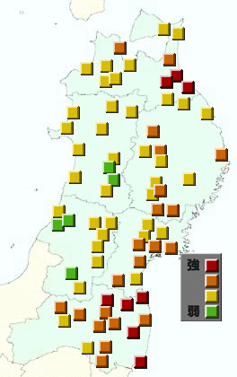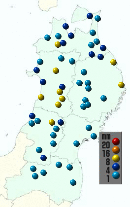 GotoHome Return Prev Next むつ 平均: -3.5℃ 最高: 0.6℃ 最低: -7.3℃ 小田野沢 平均: -3.4℃ 最高: -0.1℃ 最低: -8.5℃ 蟹田 平均: -3.8℃ 最高: -1.2℃ 最低: -8.0℃ 五所川原 平均: -3.4℃ 最高: -1.4℃ 最低: -4.7℃ 青森 平均: -3.5℃ 最高: -1.7℃ 最低: -5.1℃ 六ケ所 平均: -3.9℃ 最高: -1.8℃ 最低: -11.3℃ 鯵ケ沢 平均: -2.6℃ 最高: -1.4℃ 最低: -4.2℃ 弘前 平均: -4.1℃ 最高: -1.6℃ 最低: -7.0℃ 黒石 平均: -4.4℃ 最高: -3.0℃ 最低: -6.7℃ 三沢 平均: -3.2℃ 最高: -0.8℃ 最低: -8.2℃ 十和田 平均: -3.9℃ 最高: -1.7℃ 最低: -11.5℃ 八戸 平均: -2.8℃ 最高: -0.3℃ 最低: -6.5℃ 三戸 平均: -3.4℃ 最高: -0.1℃ 最低: -9.5℃ 能代 平均: -2.3℃ 最高: -1.2℃ 最低: -4.0℃ 大館 平均: -3.1℃ 最高: -0.3℃ 最低: -6.1℃ 鹿角 平均: -4.1℃ 最高: -2.1℃ 最低: -6.6℃ 大潟 平均: 欠測 最高: 欠測 最低: 欠測 阿仁合 平均: -4.2℃ 最高: -2.9℃ 最低: -7.4℃ 秋田 平均: -2.7℃ 最高: -1.5℃ 最低: -4.2℃ 角館 平均: -2.6℃ 最高: -1.0℃ 最低: -5.0℃ 大曲 平均: -3.3℃ 最高: -1.6℃ 最低: -4.8℃ 本荘 平均: -2.0℃ 最高: -0.7℃ 最低: -3.8℃ 横手 平均: -3.3℃ 最高: -1.7℃ 最低: -4.8℃ 湯沢 平均: -3.3℃ 最高: -1.7℃ 最低: -6.0℃ 軽米 平均: -5.1℃ 最高: -1.8℃ 最低: -13.4℃ 久慈 平均: -2.2℃ 最高: 0.3℃ 最低: -5.2℃ 岩手松尾 平均: -5.2℃ 最高: -2.4℃ 最低: -12.2℃ 雫石 平均: -4.1℃ 最高: -1.5℃ 最低: -9.4℃ 盛岡 平均: -3.4℃ 最高: -0.1℃ 最低: -9.2℃ 宮古 平均: -1.5℃ 最高: 1.3℃ 最低: -5.5℃ 紫波 平均: -3.9℃ 最高: -1.3℃ 最低: -9.0℃ 遠野 平均: -4.6℃ 最高: -0.7℃ 最低: -13.1℃ 北上 平均: -2.3℃ 最高: -0.2℃ 最低: -4.8℃ 若柳 平均: -3.2℃ 最高: -0.7℃ 最低: -5.3℃ 江刺 平均: -2.6℃ 最高: -0.6℃ 最低: -5.2℃ 一関 平均: -1.4℃ 最高: 1.3℃ 最低: -4.0℃ 千厩 平均: -2.1℃ 最高: 0.0℃ 最低: -4.9℃ 築舘 平均: -1.9℃ 最高: 0.0℃ 最低: -5.4℃ 米山 平均: -1.0℃ 最高: 1.4℃ 最低: -5.2℃ 古川 平均: -1.5℃ 最高: 0.7℃ 最低: -4.3℃ 大衡 平均: -1.4℃ 最高: 1.1℃ 最低: -4.9℃ 鹿島台 平均: -0.8℃ 最高: 1.5℃ 最低: -3.9℃ 石巻 平均: -0.7℃ 最高: 2.4℃ 最低: -3.6℃ 仙台 平均: 0.0℃ 最高: 2.4℃ 最低: -2.2℃ 白石 平均: -0.3℃ 最高: 2.1℃ 最低: -3.1℃ 亘理 平均: 0.0℃ 最高: 2.4℃ 最低: -4.7℃ 酒田 平均: -0.7℃ 最高: 0.9℃ 最低: -2.2℃ 鶴岡 平均: -1.3℃ 最高: 0.0℃ 最低: -2.6℃ 狩川 平均: -2.3℃ 最高: -0.9℃ 最低: -4.1℃ 新庄 平均: -2.7℃ 最高: -0.9℃ 最低: -5.2℃ 向町 平均: -3.3℃ 最高: -1.3℃ 最低: -5.0℃ 尾花沢 平均: -2.8℃ 最高: -0.5℃ 最低: -4.3℃ 村山 平均: -2.2℃ 最高: 0.8℃ 最低: -7.0℃ 山形 平均: -1.9℃ 最高: 0.3℃ 最低: -4.0℃ 長井 平均: -3.0℃ 最高: -0.5℃ 最低: -5.3℃ 米沢 平均: -2.7℃ 最高: -0.1℃ 最低: -4.1℃ 福島 平均: 0.1℃ 最高: 2.7℃ 最低: -3.0℃ 相馬 平均: 0.6℃ 最高: 2.9℃ 最低: -2.2℃ 喜多方 平均: -2.6℃ 最高: 0.0℃ 最低: -4.8℃ 飯舘 平均: -3.0℃ 最高: 0.4℃ 最低: -6.3℃ 猪苗代 平均: -4.7℃ 最高: -1.6℃ 最低: -6.9℃ 二本松 平均: -1.0℃ 最高: 2.8℃ 最低: -4.9℃ 若松 平均: -2.4℃ 最高: 0.1℃ 最低: -4.6℃ 船引 平均: -3.5℃ 最高: 0.0℃ 最低: -7.9℃ 浪江 平均: 0.6℃ 最高: 4.2℃ 最低: -4.5℃ 郡山 平均: -1.3℃ 最高: 1.9℃ 最低: -3.5℃ 川内 平均: -2.8℃ 最高: 0.2℃ 最低: -9.0℃ 白河 平均: -1.9℃ 最高: 0.3℃ 最低: -4.4℃ 石川 平均: -1.9℃ 最高: 0.5℃ 最低: -4.0℃ 東白川 平均: -1.2℃ 最高: 1.8℃ 最低: -5.5℃ 小名浜 平均: 1.9℃ 最高: 5.3℃ 最低: -1.5℃ むつ : 3.9時間 小田野沢 : 4.7時間 蟹田 : 5.1時間 五所川原 : 1.4時間 青森 : 2.1時間 六ケ所 : 7.7時間 鯵ケ沢 : 1.6時間 弘前 : 2.3時間 黒石 : 2.9時間 三沢 : 9.1時間 十和田 : 8.3時間 八戸 : 8.3時間 三戸 : 4.7時間 能代 : 2.0時間 大館 : 4.6時間 鹿角 : 4.1時間 大潟 : 2.0時間 阿仁合 : 1.7時間 秋田 : 1.2時間 角館 : 2.7時間 大曲 : 0.6時間 本荘 : 1.3時間 横手 : 0.2時間 湯沢 : 1.5時間 軽米 : 4.9時間 久慈 : 4.6時間 岩手松尾 : 5.2時間 雫石 : 3.5時間 盛岡 : 5.0時間 宮古 : 5.0時間 紫波 : 2.6時間 遠野 : 1.9時間 北上 : 3.3時間 若柳 : 1.9時間 江刺 : 5.0時間 一関 : 6.6時間 千厩 : 6.5時間 築舘 : 4.2時間 米山 : 4.2時間 古川 : 4.9時間 大衡 : 5.2時間 鹿島台 : 6.6時間 石巻 : 7.3時間 仙台 : 5.6時間 白石 : 6.4時間 亘理 : 3.8時間 酒田 : 1.1時間 鶴岡 : 0.9時間 狩川 : 0.6時間 新庄 : 1.1時間 向町 : 1.0時間 尾花沢 : 2.0時間 村山 : 3.9時間 山形 : 3.6時間 長井 : 0.2時間 米沢 : 2.6時間 福島 : 8.9時間 相馬 : 8.4時間 喜多方 : 5.6時間 飯舘 : 9.4時間 猪苗代 : 5.3時間 二本松 : 5.2時間 若松 : 4.0時間 船引 : 7.8時間 浪江 : 6.9時間 郡山 : 5.0時間 川内 : 9.5時間 白河 : 4.6時間 石川 : 5.0時間 東白川 : 6.4時間 小名浜 : 10.1時間 むつ : 7.5mm 小田野沢 : 1.5mm 蟹田 : 4.0mm 五所川原 : 2.5mm 青森 : 6.5mm 六ケ所 : 3.5mm 鯵ケ沢 : 1.5mm 弘前 : 10.5mm 黒石 : 5.5mm 三沢 : 2.5mm 十和田 : 1.0mm 八戸 : 5.5mm 三戸 : 4.5mm 能代 : 2.0mm 大館 : 1.0mm 鹿角 : 2.0mm 大潟 : 6.0mm 阿仁合 : 8.5mm 秋田 : 7.5mm 角館 : 4.0mm 大曲 : 8.0mm 本荘 : 10.5mm 横手 : 15.0mm 湯沢 : 9.0mm 軽米 : 5.0mm 久慈 : 13.0mm 岩手松尾 : 0.5mm 雫石 : 1.5mm 盛岡 : 0.5mm 宮古 : 8.5mm 紫波 : 1.5mm 遠野 : 0.5mm 北上 : 0.5mm 若柳 : 1.5mm 江刺 : 1.0mm 一関 : 0.0mm 千厩 : 0.0mm 築舘 : 0.0mm 米山 : 0.5mm 古川 : 0.0mm 大衡 : 0.0mm 鹿