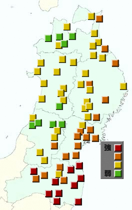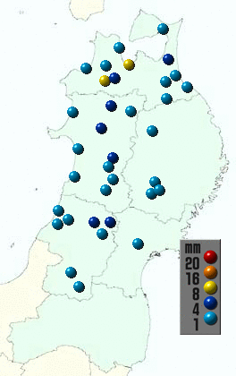 GotoHome Return Prev Next むつ 平均: -4.3℃ 最高: -2.7℃ 最低: -6.9℃ 小田野沢 平均: -4.5℃ 最高: -2.7℃ 最低: -6.0℃ 蟹田 平均: -5.2℃ 最高: -3.0℃ 最低: -8.2℃ 五所川原 平均: -4.0℃ 最高: -2.9℃ 最低: -4.9℃ 青森 平均: -4.3℃ 最高: -3.1℃ 最低: -4.9℃ 六ケ所 平均: -4.9℃ 最高: -3.5℃ 最低: -6.3℃ 鯵ケ沢 平均: -3.4℃ 最高: -2.5℃ 最低: -4.5℃ 弘前 平均: -4.5℃ 最高: -2.7℃ 最低: -5.4℃ 黒石 平均: -4.8℃ 最高: -3.4℃ 最低: -5.6℃ 三沢 平均: -4.1℃ 最高: -1.9℃ 最低: -5.7℃ 十和田 平均: -4.8℃ 最高: -2.5℃ 最低: -8.4℃ 八戸 平均: -3.8℃ 最高: -1.2℃ 最低: -5.1℃ 三戸 平均: -3.9℃ 最高: -0.8℃ 最低: -7.1℃ 能代 平均: -2.6℃ 最高: -1.3℃ 最低: -4.0℃ 大館 平均: -4.5℃ 最高: -2.1℃ 最低: -7.7℃ 鹿角 平均: -4.9℃ 最高: -3.5℃ 最低: -7.6℃ 大潟 平均: -3.0℃ 最高: -2.0℃ 最低: -4.0℃ 阿仁合 平均: -4.4℃ 最高: -3.3℃ 最低: -5.1℃ 秋田 平均: -2.2℃ 最高: -1.2℃ 最低: -3.5℃ 角館 平均: -3.9℃ 最高: -2.2℃ 最低: -6.0℃ 大曲 平均: -3.9℃ 最高: -2.5℃ 最低: -6.1℃ 本荘 平均: -1.1℃ 最高: -0.5℃ 最低: -1.9℃ 横手 平均: -3.5℃ 最高: -1.3℃ 最低: -5.4℃ 湯沢 平均: -3.3℃ 最高: -2.5℃ 最低: -4.9℃ 軽米 平均: -5.1℃ 最高: -3.0℃ 最低: -8.8℃ 久慈 平均: -3.1℃ 最高: -0.3℃ 最低: -6.1℃ 岩手松尾 平均: -5.4℃ 最高: -2.9℃ 最低: -8.5℃ 雫石 平均: -4.5℃ 最高: -2.8℃ 最低: -7.4℃ 盛岡 平均: -3.8℃ 最高: -1.4℃ 最低: -6.5℃ 宮古 平均: -2.5℃ 最高: 1.7℃ 最低: -6.4℃ 紫波 平均: -3.8℃ 最高: -1.4℃ 最低: -5.5℃ 遠野 平均: -4.5℃ 最高: -1.2℃ 最低: -9.4℃ 北上 平均: -2.8℃ 最高: -1.2℃ 最低: -3.8℃ 若柳 平均: -3.8℃ 最高: -1.2℃ 最低: -4.9℃ 江刺 平均: -2.9℃ 最高: -1.0℃ 最低: -4.0℃ 一関 平均: -2.0℃ 最高: 0.5℃ 最低: -3.6℃ 千厩 平均: -3.0℃ 最高: -1.0℃ 最低: -4.8℃ 築舘 平均: -1.7℃ 最高: 0.7℃ 最低: -3.4℃ 米山 平均: -1.6℃ 最高: 2.7℃ 最低: -4.5℃ 古川 平均: -1.7℃ 最高: 0.9℃ 最低: -3.5℃ 大衡 平均: -1.9℃ 最高: 0.6℃ 最低: -3.0℃ 鹿島台 平均: -1.5℃ 最高: 1.6℃ 最低: -3.4℃ 石巻 平均: -1.3℃ 最高: 2.1℃ 最低: -2.7℃ 仙台 平均: -0.1℃ 最高: 2.4℃ 最低: -1.6℃ 白石 平均: -0.3℃ 最高: 2.2℃ 最低: -2.2℃ 亘理 平均: -0.2℃ 最高: 3.5℃ 最低: -4.0℃ 酒田 平均: -0.5℃ 最高: 0.6℃ 最低: -1.7℃ 鶴岡 平均: -1.1℃ 最高: 0.2℃ 最低: -2.8℃ 狩川 平均: -2.0℃ 最高: -0.6℃ 最低: -3.3℃ 新庄 平均: -2.8℃ 最高: -1.5℃ 最低: -3.7℃ 向町 平均: -3.5℃ 最高: -2.6℃ 最低: -4.3℃ 尾花沢 平均: -2.9℃ 最高: -1.9℃ 最低: -3.6℃ 村山 平均: -2.5℃ 最高: -0.7℃ 最低: -3.7℃ 山形 平均: -1.6℃ 最高: 1.1℃ 最低: -3.1℃ 長井 平均: -2.6℃ 最高: -0.6℃ 最低: -3.9℃ 米沢 平均: -2.6℃ 最高: -0.8℃ 最低: -3.5℃ 福島 平均: 0.2℃ 最高: 2.9℃ 最低: -1.5℃ 相馬 平均: 0.7℃ 最高: 3.9℃ 最低: -1.1℃ 喜多方 平均: -3.5℃ 最高: -0.3℃ 最低: -8.5℃ 飯舘 平均: -3.3℃ 最高: 0.0℃ 最低: -7.8℃ 猪苗代 平均: -4.6℃ 最高: -2.2℃ 最低: -6.4℃ 二本松 平均: -1.1℃ 最高: 1.7℃ 最低: -3.7℃ 若松 平均: -2.4℃ 最高: -0.3℃ 最低: -4.0℃ 船引 平均: -2.8℃ 最高: 0.1℃ 最低: -5.0℃ 浪江 平均: 0.5℃ 最高: 4.8℃ 最低: -3.4℃ 郡山 平均: -1.0℃ 最高: 0.8℃ 最低: -2.0℃ 川内 平均: -2.3℃ 最高: 1.2℃ 最低: -4.8℃ 白河 平均: -1.3℃ 最高: 1.7℃ 最低: -3.5℃ 石川 平均: -1.3℃ 最高: 1.6℃ 最低: -4.6℃ 東白川 平均: -0.8℃ 最高: 3.0℃ 最低: -5.7℃ 小名浜 平均: 2.5℃ 最高: 6.0℃ 最低: 0.1℃ むつ : 2.5時間 小田野沢 : 5.4時間 蟹田 : 1.2時間 五所川原 : 0.5時間 青森 : 0.2時間 六ケ所 : 2.7時間 鯵ケ沢 : 0.9時間 弘前 : 2.0時間 黒石 : 0.4時間 三沢 : 4.5時間 十和田 : 4.7時間 八戸 : 6.1時間 三戸 : 3.7時間 能代 : 1.8時間 大館 : 1.6時間 鹿角 : 2.9時間 大潟 : 1.1時間 阿仁合 : 1.3時間 秋田 : 1.9時間 角館 : 1.8時間 大曲 : 2.8時間 本荘 : 2.3時間 横手 : 1.6時間 湯沢 : 0.9時間 軽米 : 4.0時間 久慈 : 5.1時間 岩手松尾 : 2.8時間 雫石 : 2.6時間 盛岡 : 5.6時間 宮古 : 4.4時間 紫波 : 3.4時間 遠野 : 5.8時間 北上 : 4.7時間 若柳 : 1.1時間 江刺 : 3.9時間 一関 : 3.8時間 千厩 : 5.4時間 築舘 : 4.0時間 米山 : 5.0時間 古川 : 5.9時間 大衡 : 5.2時間 鹿島台 : 7.5時間 石巻 : 7.5時間 仙台 : 7.1時間 白石 : 6.4時間 亘理 : 6.6時間 酒田 : 1.5時間 鶴岡 : 0.7時間 狩川 : 0.4時間 新庄 : 0.8時間 向町 : 0.8時間 尾花沢 : 1.5時間 村山 : 4.1時間 山形 : 7.4時間 長井 : 1.5時間 米沢 : 3.0時間 福島 : 7.7時間 相馬 : 10.1時間 喜多方 : 8.2時間 飯舘 : 8.9時間 猪苗代 : 7.9時間 二本松 : 4.5時間 若松 : 7.1時間 船引 : 7.6時間 浪江 : 8.1時間 郡山 : 8.1時間 川内 : 8.2時間 白河 : 8.3時間 石川 : 8.7時間 東白川 : 9.2時間 小名浜 : 10.8時間 むつ : 1.0mm 小田野沢 : 0.0mm 蟹田 : 3.0mm 五所川原 : 2.5mm 青森 : 13.0mm 六ケ所 : 5.0mm 鯵ケ沢 : 2.0mm 弘前 : 10.5mm 黒石 : 5.0mm 三沢 : 2.0mm 十和田 : 0.5mm 八戸 : 0.5mm 三戸 : 1.0mm 能代 : 3.0mm 大館 : 4.0mm 鹿角 : 2.0mm 大潟 : 0.0mm 阿仁合 : 5.0mm 秋田 : 1.5mm 角館 : 7.5mm 大曲 : 1.5mm 本荘 : 0.5mm 横手 : 1.0mm 湯沢 : 2.5mm 軽米 : 0.0mm 久慈 : 0.0mm 岩手松尾 : 1.0mm 雫石 : 0.0mm 盛岡 : 0.0mm 宮古 : 0.0mm 紫波 : 0.0mm 遠野 : 0.0mm 北上 : 1.5mm 若柳 : 1.5mm 江刺 : 1.5mm 一関 : 0.0mm 千厩 : 0.0mm 築舘 : 0.0mm 米山 : 0.0mm 古川 : 0.0mm 大衡 : 0.5mm 