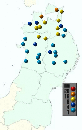 GotoHome Return Prev Next むつ 平均: 0.7℃ 最高: 3.1℃ 最低: -0.8℃ 小田野沢 平均: 0.5℃ 最高: 2.6℃ 最低: -2.6℃ 蟹田 平均: 0.8℃ 最高: 2.9℃ 最低: -0.9℃ 五所川原 平均: 1.1℃ 最高: 3.0℃ 最低: 0.0℃ 青森 平均: 1.1℃ 最高: 3.8℃ 最低: -1.0℃ 六ケ所 平均: 0.2℃ 最高: 2.7℃ 最低: -1.6℃ 鯵ケ沢 平均: 1.2℃ 最高: 2.9℃ 最低: 0.0℃ 弘前 平均: 0.6℃ 最高: 3.0℃ 最低: -0.9℃ 黒石 平均: 0.3℃ 最高: 2.9℃ 最低: -2.5℃ 三沢 平均: 1.0℃ 最高: 4.1℃ 最低: -1.2℃ 十和田 平均: 0.7℃ 最高: 3.3℃ 最低: -1.1℃ 八戸 平均: 1.1℃ 最高: 4.5℃ 最低: -0.8℃ 三戸 平均: 0.6℃ 最高: 4.9℃ 最低: -2.4℃ 能代 平均: 2.1℃ 最高: 5.8℃ 最低: 0.4℃ 大館 平均: 0.7℃ 最高: 3.2℃ 最低: -1.6℃ 鹿角 平均: 0.1℃ 最高: 2.5℃ 最低: -1.9℃ 大潟 平均: 2.2℃ 最高: 6.1℃ 最低: 0.6℃ 阿仁合 平均: 0.8℃ 最高: 4.4℃ 最低: -2.4℃ 秋田 平均: 2.7℃ 最高: 5.1℃ 最低: 0.2℃ 角館 平均: 0.6℃ 最高: 3.1℃ 最低: -2.5℃ 大曲 平均: 0.8℃ 最高: 3.1℃ 最低: -2.0℃ 本荘 平均: 3.5℃ 最高: 6.3℃ 最低: -0.1℃ 横手 平均: 1.4℃ 最高: 3.9℃ 最低: -1.6℃ 湯沢 平均: 1.4℃ 最高: 4.9℃ 最低: -1.7℃ 軽米 平均: -0.1℃ 最高: 3.7℃ 最低: -2.5℃ 久慈 平均: 0.8℃ 最高: 4.9℃ 最低: -3.6℃ 岩手松尾 平均: -1.7℃ 最高: 2.0℃ 最低: -6.0℃ 雫石 平均: -0.4℃ 最高: 0.6℃ 最低: -1.5℃ 盛岡 平均: -0.3℃ 最高: 1.7℃ 最低: -4.1℃ 宮古 平均: 0.5℃ 最高: 3.8℃ 最低: -4.2℃ 紫波 平均: -0.7℃ 最高: 1.4℃ 最低: -4.6℃ 遠野 平均: -0.4℃ 最高: 4.2℃ 最低: -5.9℃ 北上 平均: 1.6℃ 最高: 3.9℃ 最低: -0.4℃ 若柳 平均: 0.5℃ 最高: 4.0℃ 最低: -4.9℃ 江刺 平均: 1.5℃ 最高: 5.0℃ 最低: -2.8℃ 一関 平均: 2.3℃ 最高: 7.3℃ 最低: -3.3℃ 千厩 平均: 1.2℃ 最高: 6.2℃ 最低: -3.6℃ 築舘 平均: 1.5℃ 最高: 6.8℃ 最低: -4.7℃ 米山 平均: 1.6℃ 最高: 6.4℃ 最低: -3.8℃ 古川 平均: 2.3℃ 最高: 6.4℃ 最低: -2.2℃ 大衡 平均: 2.7℃ 最高: 6.0℃ 最低: -0.7℃ 鹿島台 平均: 2.0℃ 最高: 5.8℃ 最低: -1.5℃ 石巻 平均: 2.5℃ 最高: 5.1℃ 最低: -0.6℃ 仙台 平均: 3.1℃ 最高: 5.8℃ 最低: 0.2℃ 白石 平均: 2.6℃ 最高: 8.0℃ 最低: -2.3℃ 亘理 平均: 3.3℃ 最高: 6.7℃ 最低: -0.9℃ 酒田 平均: 4.9℃ 最高: 9.9℃ 最低: -0.5℃ 鶴岡 平均: 4.2℃ 最高: 9.4℃ 最低: -0.5℃ 狩川 平均: 2.9℃ 最高: 7.3℃ 最低: -2.8℃ 新庄 平均: 1.2℃ 最高: 4.7℃ 最低: -3.8℃ 向町 平均: 1.6℃ 最高: 6.8℃ 最低: -2.6℃ 尾花沢 平均: 1.7℃ 最高: 6.1℃ 最低: -3.2℃ 村山 平均: 0.8℃ 最高: 7.2℃ 最低: -4.0℃ 山形 平均: 1.7℃ 最高: 6.8℃ 最低: -2.6℃ 長井 平均: 0.2℃ 最高: 6.7℃ 最低: -3.8℃ 米沢 平均: 1.8℃ 最高: 7.0℃ 最低: -2.5℃ 福島 平均: 4.0℃ 最高: 11.0℃ 最低: -1.0℃ 相馬 平均: 3.4℃ 最高: 6.7℃ 最低: -1.5℃ 喜多方 平均: -0.2℃ 最高: 5.6℃ 最低: -5.6℃ 飯舘 平均: 1.0℃ 最高: 7.5℃ 最低: -6.6℃ 猪苗代 平均: 0.8℃ 最高: 9.1℃ 最低: -5.9℃ 二本松 平均: 4.3℃ 最高: 11.7℃ 最低: -2.2℃ 若松 平均: 1.1℃ 最高: 7.3℃ 最低: -4.4℃ 船引 平均: 4.2℃ 最高: 10.1℃ 最低: -2.8℃ 浪江 平均: 3.5℃ 最高: 6.9℃ 最低: -1.3℃ 郡山 平均: 5.2℃ 最高: 11.2℃ 最低: -1.4℃ 川内 平均: 4.0℃ 最高: 10.8℃ 最低: -2.0℃ 白河 平均: 4.6℃ 最高: 9.2℃ 最低: -1.6℃ 石川 平均: 3.8℃ 最高: 11.6℃ 最低: -2.0℃ 東白川 平均: 3.9℃ 最高: 10.8℃ 最低: -1.8℃ 小名浜 平均: 5.0℃ 最高: 6.6℃ 最低: 1.8℃ むつ : 3.7時間 小田野沢 : 3.7時間 蟹田 : 4.3時間 五所川原 : 3.0時間 青森 : 3.5時間 六ケ所 : 4.3時間 鯵ケ沢 : 2.5時間 弘前 : 3.3時間 黒石 : 2.2時間 三沢 : 4.4時間 十和田 : 4.3時間 八戸 : 3.9時間 三戸 : 3.1時間 能代 : 0.3時間 大館 : 2.1時間 鹿角 : 1.5時間 大潟 : 0.6時間 阿仁合 : 1.5時間 秋田 : 0.0時間 角館 : 0.4時間 大曲 : 0.0時間 本荘 : 0.6時間 横手 : 0.4時間 湯沢 : 2.9時間 軽米 : 3.8時間 久慈 : 2.1時間 岩手松尾 : 2.8時間 雫石 : 2.0時間 盛岡 : 2.3時間 宮古 : 1.5時間 紫波 : 1.4時間 遠野 : 1.0時間 北上 : 0.4時間 若柳 : 3.8時間 江刺 : 3.7時間 一関 : 5.3時間 千厩 : 5.3時間 築舘 : 5.0時間 米山 : 4.7時間 古川 : 5.0時間 大衡 : 5.5時間 鹿島台 : 3.1時間 石巻 : 0.4時間 仙台 : 2.5時間 白石 : 7.1時間 亘理 : 6.8時間 酒田 : 5.1時間 鶴岡 : 7.0時間 狩川 : 5.4時間 新庄 : 5.2時間 向町 : 6.3時間 尾花沢 : 7.1時間 村山 : 8.1時間 山形 : 6.2時間 長井 : 4.4時間 米沢 : 8.9時間 福島 : 5.8時間 相馬 : 6.0時間 喜多方 : 6.6時間 飯舘 : 7.3時間 猪苗代 : 6.9時間 二本松 : 8.0時間 若松 : 8.4時間 船引 : 8.8時間 浪江 : 8.4時間 郡山 : 8.4時間 川内 : 5.9時間 白河 : 1.3時間 石川 : 2.4時間 東白川 : 0.8時間 小名浜 : 0.0時間 むつ : 17.0mm 小田野沢 : 14.0mm 蟹田 : 17.0mm 五所川原 : 7.5mm 青森 : 8.5mm 六ケ所 : 10.5mm 鯵ケ沢 : 6.0mm 弘前 : 9.0mm 黒石 : 8.0mm 三沢 : 7.5mm 十和田 : 8.0mm 八戸 : 3.0mm 三戸 : 8.0mm 能代 : 1.5mm 大館 : 13.5mm 鹿角 : 8.0mm 大潟 : 1.0mm 阿仁合 : 5.0mm 秋田 : 2.0mm 角館 : 3.5mm 大曲 : 0.5mm 本荘 : 1.0mm 横手 : 2.0mm 湯沢 : 0.0mm 軽米 : 1.5mm 久慈 : 0.0mm 岩手松尾 : 1.0mm 雫石 : 7.0mm 盛岡 : 2.0mm 宮古 : 0.0mm 紫波 : 2.0mm 遠野 : 0.5mm 北上 : 0.5mm 若柳 : 0.0mm 江刺 : 0.0mm 一関 : 0.0mm 千厩 : 0.0mm 築舘 : 0.0mm 米山 : 0.0mm 古川 : 0.0mm 大衡 : 0.0mm 鹿島台 : 0.0mm 石巻 : 0.0mm 仙台 : 0.0mm 白石 : 0.0mm 亘理 : 0.0mm 酒田 : 0.0mm 鶴岡 : 0