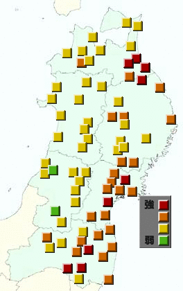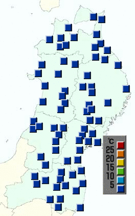 GotoHome Return Prev Next むつ 平均: -1.8℃ 最高: 2.0℃ 最低: -8.1℃ 小田野沢 平均: -1.9℃ 最高: 1.0℃ 最低: -8.1℃ 蟹田 平均: -1.3℃ 最高: 1.4℃ 最低: -6.5℃ 五所川原 平均: -1.2℃ 最高: 1.6℃ 最低: -5.8℃ 青森 平均: -1.0℃ 最高: 1.0℃ 最低: -3.7℃ 六ケ所 平均: -2.3℃ 最高: -0.2℃ 最低: -5.8℃ 鯵ケ沢 平均: 0.0℃ 最高: 2.3℃ 最低: -2.9℃ 弘前 平均: -1.5℃ 最高: 1.2℃ 最低: -7.3℃ 黒石 平均: -2.0℃ 最高: 0.9℃ 最低: -6.8℃ 三沢 平均: -1.0℃ 最高: 3.7℃ 最低: -6.4℃ 十和田 平均: -2.5℃ 最高: 2.1℃ 最低: -11.1℃ 八戸 平均: -1.0℃ 最高: 2.7℃ 最低: -5.7℃ 三戸 平均: -1.3℃ 最高: 2.8℃ 最低: -7.2℃ 能代 平均: 0.8℃ 最高: 2.7℃ 最低: -2.0℃ 大館 平均: -1.4℃ 最高: 1.8℃ 最低: -5.5℃ 鹿角 平均: -2.4℃ 最高: 0.5℃ 最低: -6.4℃ 大潟 平均: 0.1℃ 最高: 2.4℃ 最低: -3.1℃ 阿仁合 平均: -1.7℃ 最高: 0.5℃ 最低: -4.3℃ 秋田 平均: 0.6℃ 最高: 3.3℃ 最低: -3.4℃ 角館 平均: -1.4℃ 最高: 2.0℃ 最低: -4.1℃ 大曲 平均: -1.2℃ 最高: 1.9℃ 最低: -4.0℃ 本荘 平均: 1.2℃ 最高: 3.6℃ 最低: -1.6℃ 横手 平均: -1.1℃ 最高: 1.5℃ 最低: -4.1℃ 湯沢 平均: -1.2℃ 最高: 1.6℃ 最低: -4.1℃ 軽米 平均: -3.4℃ 最高: 0.9℃ 最低: -11.4℃ 久慈 平均: -1.7℃ 最高: 4.0℃ 最低: -8.1℃ 岩手松尾 平均: -3.4℃ 最高: 0.6℃ 最低: -9.0℃ 雫石 平均: -2.3℃ 最高: 0.8℃ 最低: -6.4℃ 盛岡 平均: -1.8℃ 最高: 1.7℃ 最低: -4.8℃ 宮古 平均: 0.3℃ 最高: 4.8℃ 最低: -4.5℃ 紫波 平均: -2.1℃ 最高: 2.0℃ 最低: -5.0℃ 遠野 平均: -2.5℃ 最高: 0.9℃ 最低: -4.7℃ 北上 平均: -1.1℃ 最高: 1.9℃ 最低: -3.7℃ 若柳 平均: -1.5℃ 最高: 1.6℃ 最低: -5.0℃ 江刺 平均: -1.4℃ 最高: 1.2℃ 最低: -4.1℃ 一関 平均: 0.6℃ 最高: 4.8℃ 最低: -3.0℃ 千厩 平均: -0.8℃ 最高: 3.0℃ 最低: -4.3℃ 築舘 平均: 0.6℃ 最高: 5.3℃ 最低: -2.8℃ 米山 平均: 0.7℃ 最高: 6.9℃ 最低: -3.9℃ 古川 平均: 0.0℃ 最高: 4.8℃ 最低: -3.0℃ 大衡 平均: 0.2℃ 最高: 4.5℃ 最低: -2.8℃ 鹿島台 平均: -0.5℃ 最高: 4.9℃ 最低: -5.3℃ 石巻 平均: 1.1℃ 最高: 5.3℃ 最低: -3.4℃ 仙台 平均: 1.6℃ 最高: 5.1℃ 最低: -1.9℃ 白石 平均: 0.7℃ 最高: 4.8℃ 最低: -2.9℃ 亘理 平均: 1.5℃ 最高: 5.2℃ 最低: -2.3℃ 酒田 平均: 2.2℃ 最高: 4.3℃ 最低: 0.4℃ 鶴岡 平均: 1.4℃ 最高: 3.7℃ 最低: -0.2℃ 狩川 平均: 0.3℃ 最高: 2.6℃ 最低: -1.6℃ 新庄 平均: -1.0℃ 最高: 2.6℃ 最低: -4.3℃ 向町 平均: -1.7℃ 最高: 1.7℃ 最低: -3.5℃ 尾花沢 平均: -1.1℃ 最高: 1.9℃ 最低: -3.9℃ 村山 平均: -0.9℃ 最高: 2.2℃ 最低: -3.2℃ 山形 平均: 0.2℃ 最高: 3.8℃ 最低: -2.2℃ 長井 平均: -2.2℃ 最高: 0.4℃ 最低: -4.7℃ 米沢 平均: -1.7℃ 最高: 1.6℃ 最低: -5.7℃ 福島 平均: 0.5℃ 最高: 3.9℃ 最低: -3.7℃ 相馬 平均: 1.3℃ 最高: 6.4℃ 最低: -2.5℃ 喜多方 平均: -1.3℃ 最高: 1.5℃ 最低: -3.5℃ 飯舘 平均: -3.1℃ 最高: 2.9℃ 最低: -11.0℃ 猪苗代 平均: -3.5℃ 最高: -0.6℃ 最低: -5.5℃ 二本松 平均: 0.5℃ 最高: 5.3℃ 最低: -2.4℃ 若松 平均: -1.0℃ 最高: 2.0℃ 最低: -3.1℃ 船引 平均: -1.9℃ 最高: 2.0℃ 最低: -5.4℃ 浪江 平均: 2.1℃ 最高: 6.8℃ 最低: -2.6℃ 郡山 平均: 0.0℃ 最高: 4.3℃ 最低: -3.3℃ 川内 平均: -1.3℃ 最高: 3.5℃ 最低: -5.9℃ 白河 平均: -0.9℃ 最高: 5.0℃ 最低: -6.4℃ 石川 平均: -0.8℃ 最高: 5.0℃ 最低: -5.9℃ 東白川 平均: -1.2℃ 最高: 5.1℃ 最低: -7.4℃ 小名浜 平均: 2.8℃ 最高: 7.5℃ 最低: -2.2℃ むつ : 2.5時間 小田野沢 : 3.0時間 蟹田 : 2.2時間 五所川原 : 2.3時間 青森 : 2.7時間 六ケ所 : 4.7時間 鯵ケ沢 : 1.7時間 弘前 : 5.9時間 黒石 : 4.9時間 三沢 : 9.2時間 十和田 : 9.2時間 八戸 : 8.3時間 三戸 : 7.9時間 能代 : 1.5時間 大館 : 3.5時間 鹿角 : 2.6時間 大潟 : 1.9時間 阿仁合 : 1.7時間 秋田 : 2.1時間 角館 : 2.0時間 大曲 : 2.0時間 本荘 : 2.5時間 横手 : 1.6時間 湯沢 : 2.2時間 軽米 : 8.5時間 久慈 : 6.7時間 岩手松尾 : 3.0時間 雫石 : 5.4時間 盛岡 : 6.4時間 宮古 : 6.9時間 紫波 : 3.4時間 遠野 : 2.0時間 北上 : 3.4時間 若柳 : 1.4時間 江刺 : 2.4時間 一関 : 7.6時間 千厩 : 6.8時間 築舘 : 6.8時間 米山 : 9.7時間 古川 : 6.6時間 大衡 : 6.2時間 鹿島台 : 6.6時間 石巻 : 7.8時間 仙台 : 8.5時間 白石 : 7.3時間 亘理 : 5.7時間 酒田 : 4.1時間 鶴岡 : 1.1時間 狩川 : 0.9時間 新庄 : 2.5時間 向町 : 3.5時間 尾花沢 : 4.3時間 村山 : 2.6時間 山形 : 3.9時間 長井 : 0.5時間 米沢 : 3.9時間 福島 : 4.3時間 相馬 : 7.2時間 喜多方 : 7.3時間 飯舘 : 5.1時間 猪苗代 : 1.3時間 二本松 : 7.1時間 若松 : 4.9時間 船引 : 9.3時間 浪江 : 7.8時間 郡山 : 7.4時間 川内 : 7.4時間 白河 : 9.9時間 石川 : 9.2時間 東白川 : 4.3時間 小名浜 : 7.0時間 むつ : 4.0mm 小田野沢 : 4.5mm 蟹田 : 4.5mm 五所川原 : 5.0mm 青森 : 5.0mm 六ケ所 : 2.5mm 鯵ケ沢 : 2.0mm 弘前 : 1.5mm 黒石 : 0.5mm 三沢 : 0.0mm 十和田 : 0.0mm 八戸 : 0.0mm 三戸 : 0.0mm 能代 : 1.5mm 大館 : 1.5mm 鹿角 : 1.5mm 大潟 : 1.0mm 阿仁合 : 5.5mm 秋田 : 1.5mm 角館 : 10.0mm 大曲 : 11.0mm 本荘 : 5.5mm 横手 : 7.5mm 湯沢 : 4.5mm 軽米 : 0.0mm 久慈 : 0.0mm 岩手松尾 : 0.0mm 雫石 : 0.5mm 盛岡 : 0.0mm 宮古 : 0.0mm 紫波 : 1.0mm 遠野 : 0.5mm 北上 : 0.5mm 若柳 : 0.5mm 江刺 : 0.0mm 一関 : 0.0mm 千厩 : 0.0mm 築舘 : 0.5mm 米山 : 0.0mm 古川 : 1.5mm 大衡 : 0.0mm 鹿島台 : 0.0mm 石巻 : 0.0mm 仙台 : 0.0mm 白石 : 0.0mm 