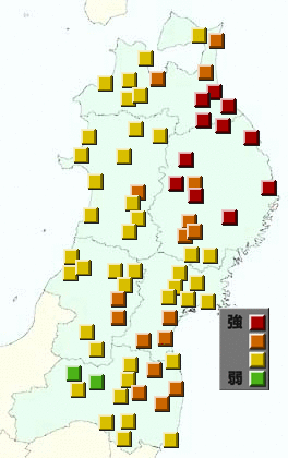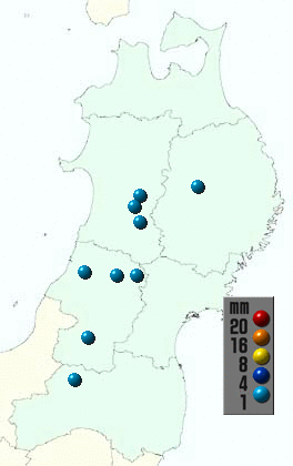 GotoHome Return Prev Next むつ 平均: 3.2℃ 最高: 6.8℃ 最低: 0.2℃ 小田野沢 平均: 2.6℃ 最高: 6.6℃ 最低: -1.0℃ 蟹田 平均: 2.9℃ 最高: 6.6℃ 最低: -0.4℃ 五所川原 平均: 3.5℃ 最高: 8.4℃ 最低: 0.2℃ 青森 平均: 3.5℃ 最高: 6.9℃ 最低: 0.3℃ 六ケ所 平均: 2.6℃ 最高: 6.2℃ 最低: -0.4℃ 鯵ケ沢 平均: 4.3℃ 最高: 7.2℃ 最低: 1.6℃ 弘前 平均: 3.1℃ 最高: 6.6℃ 最低: -0.5℃ 黒石 平均: 3.0℃ 最高: 6.5℃ 最低: -0.7℃ 三沢 平均: 3.3℃ 最高: 8.1℃ 最低: -1.8℃ 十和田 平均: 2.5℃ 最高: 6.9℃ 最低: -2.1℃ 八戸 平均: 3.9℃ 最高: 9.0℃ 最低: -0.5℃ 三戸 平均: 3.2℃ 最高: 8.9℃ 最低: -1.0℃ 能代 平均: 4.2℃ 最高: 8.0℃ 最低: 1.6℃ 大館 平均: 2.5℃ 最高: 6.5℃ 最低: -0.6℃ 鹿角 平均: 2.0℃ 最高: 5.6℃ 最低: -1.0℃ 大潟 平均: 2.7℃ 最高: 5.4℃ 最低: 0.5℃ 阿仁合 平均: 1.5℃ 最高: 5.3℃ 最低: -1.2℃ 秋田 平均: 4.0℃ 最高: 7.1℃ 最低: 1.6℃ 角館 平均: 1.2℃ 最高: 5.8℃ 最低: -4.9℃ 大曲 平均: 1.2℃ 最高: 5.1℃ 最低: -3.3℃ 本荘 平均: 3.4℃ 最高: 7.1℃ 最低: -0.2℃ 横手 平均: 2.0℃ 最高: 5.5℃ 最低: -1.2℃ 湯沢 平均: 1.6℃ 最高: 5.4℃ 最低: -1.4℃ 軽米 平均: 2.0℃ 最高: 7.4℃ 最低: -1.8℃ 久慈 平均: 2.3℃ 最高: 7.4℃ 最低: -4.1℃ 岩手松尾 平均: 1.4℃ 最高: 6.8℃ 最低: -6.1℃ 雫石 平均: 2.0℃ 最高: 5.9℃ 最低: -1.3℃ 盛岡 平均: 2.1℃ 最高: 6.9℃ 最低: -2.1℃ 宮古 平均: 4.3℃ 最高: 9.0℃ 最低: -0.6℃ 紫波 平均: 2.0℃ 最高: 6.6℃ 最低: -2.5℃ 遠野 平均: 1.8℃ 最高: 6.1℃ 最低: -3.1℃ 北上 平均: 3.1℃ 最高: 7.8℃ 最低: -0.9℃ 若柳 平均: 2.5℃ 最高: 7.0℃ 最低: -1.1℃ 江刺 平均: 3.3℃ 最高: 7.9℃ 最低: -0.7℃ 一関 平均: 4.5℃ 最高: 9.9℃ 最低: 0.0℃ 千厩 平均: 3.3℃ 最高: 8.6℃ 最低: -1.4℃ 築舘 平均: 3.9℃ 最高: 9.5℃ 最低: -0.7℃ 米山 平均: 4.1℃ 最高: 9.9℃ 最低: -1.8℃ 古川 平均: 3.3℃ 最高: 9.3℃ 最低: -2.4℃ 大衡 平均: 3.5℃ 最高: 9.6℃ 最低: -1.9℃ 鹿島台 平均: 3.4℃ 最高: 10.1℃ 最低: -2.2℃ 石巻 平均: 4.7℃ 最高: 7.5℃ 最低: 1.7℃ 仙台 平均: 4.7℃ 最高: 9.8℃ 最低: -0.5℃ 白石 平均: 4.4℃ 最高: 10.2℃ 最低: -0.2℃ 亘理 平均: 5.2℃ 最高: 10.7℃ 最低: 0.7℃ 酒田 平均: 5.1℃ 最高: 8.5℃ 最低: 2.0℃ 鶴岡 平均: 4.4℃ 最高: 8.0℃ 最低: 1.7℃ 狩川 平均: 2.9℃ 最高: 6.1℃ 最低: -0.1℃ 新庄 平均: 1.7℃ 最高: 5.9℃ 最低: -1.0℃ 向町 平均: 1.6℃ 最高: 6.3℃ 最低: -1.6℃ 尾花沢 平均: 2.3℃ 最高: 6.5℃ 最低: -0.9℃ 村山 平均: 2.5℃ 最高: 8.3℃ 最低: -2.4℃ 山形 平均: 3.6℃ 最高: 7.8℃ 最低: -1.5℃ 長井 平均: 1.5℃ 最高: 5.9℃ 最低: -1.8℃ 米沢 平均: 2.5℃ 最高: 6.6℃ 最低: -1.5℃ 福島 平均: 5.3℃ 最高: 11.7℃ 最低: -0.8℃ 相馬 平均: 5.5℃ 最高: 10.0℃ 最低: 1.5℃ 喜多方 平均: 0.5℃ 最高: 5.7℃ 最低: -3.6℃ 飯舘 平均: 2.4℃ 最高: 8.3℃ 最低: -2.7℃ 猪苗代 平均: 0.6℃ 最高: 6.5℃ 最低: -2.7℃ 二本松 平均: 4.8℃ 最高: 10.2℃ 最低: -0.3℃ 若松 平均: 0.9℃ 最高: 6.0℃ 最低: -3.2℃ 船引 平均: 2.7℃ 最高: 8.5℃ 最低: -2.0℃ 浪江 平均: 4.4℃ 最高: 10.1℃ 最低: -1.9℃ 郡山 平均: 3.6℃ 最高: 10.0℃ 最低: -3.1℃ 川内 平均: 1.1℃ 最高: 9.1℃ 最低: -5.2℃ 白河 平均: 2.1℃ 最高: 8.7℃ 最低: -5.2℃ 石川 平均: 1.9℃ 最高: 9.9℃ 最低: -5.4℃ 東白川 平均: 1.3℃ 最高: 9.8℃ 最低: -7.0℃ 小名浜 平均: 4.0℃ 最高: 8.4℃ 最低: -2.4℃ むつ : 3.8時間 小田野沢 : 5.9時間 蟹田 : 3.6時間 五所川原 : 4.9時間 青森 : 5.1時間 六ケ所 : 6.5時間 鯵ケ沢 : 4.3時間 弘前 : 3.1時間 黒石 : 2.7時間 三沢 : 8.9時間 十和田 : 9.8時間 八戸 : 9.9時間 三戸 : 8.1時間 能代 : 2.7時間 大館 : 1.5時間 鹿角 : 3.4時間 大潟 : 2.1時間 阿仁合 : 3.7時間 秋田 : 3.3時間 角館 : 5.8時間 大曲 : 4.2時間 本荘 : 3.0時間 横手 : 3.4時間 湯沢 : 2.3時間 軽米 : 8.2時間 久慈 : 9.1時間 岩手松尾 : 9.9時間 雫石 : 8.3時間 盛岡 : 7.9時間 宮古 : 8.5時間 紫波 : 8.3時間 遠野 : 8.2時間 北上 : 5.6時間 若柳 : 5.1時間 江刺 : 5.5時間 一関 : 4.4時間 千厩 : 4.9時間 築舘 : 4.3時間 米山 : 3.8時間 古川 : 4.1時間 大衡 : 3.4時間 鹿島台 : 3.8時間 石巻 : 4.2時間 仙台 : 6.0時間 白石 : 6.3時間 亘理 : 5.8時間 酒田 : 1.7時間 鶴岡 : 3.5時間 狩川 : 3.0時間 新庄 : 4.0時間 向町 : 3.7時間 尾花沢 : 4.4時間 村山 : 5.2時間 山形 : 6.8時間 長井 : 3.7時間 米沢 : 1.5時間 福島 : 4.1時間 相馬 : 3.9時間 喜多方 : 0.8時間 飯舘 : 5.2時間 猪苗代 : 0.8時間 二本松 : 2.4時間 若松 : 3.4時間 船引 : 7.2時間 浪江 : 7.6時間 郡山 : 4.6時間 川内 : 5.0時間 白河 : 3.8時間 石川 : 4.6時間 東白川 : 1.4時間 小名浜 : 4.1時間 むつ : 0.0mm 小田野沢 : 0.0mm 蟹田 : 0.0mm 五所川原 : 0.0mm 青森 : 0.0mm 六ケ所 : 0.0mm 鯵ケ沢 : 0.0mm 弘前 : 0.0mm 黒石 : 0.0mm 三沢 : 0.0mm 十和田 : 0.0mm 八戸 : 0.0mm 三戸 : 0.0mm 能代 : 0.0mm 大館 : 0.0mm 鹿角 : 0.0mm 大潟 : 0.0mm 阿仁合 : 0.0mm 秋田 : 0.0mm 角館 : 0.5mm 大曲 : 0.5mm 本荘 : 0.0mm 横手 : 0.5mm 湯沢 : 0.0mm 軽米 : 0.0mm 久慈 : 0.0mm 岩手松尾 : 0.0mm 雫石 : 0.0mm 盛岡 : 0.5mm 宮古 : 0.0mm 紫波 : 0.0mm 遠野 : 0.0mm 北上 : 0.0mm 若柳 : 0.0mm 江刺 : 0.0mm 一関 : 0.0mm 千厩 : 0.0mm 築舘 : 0.0mm 米山 : 0.0mm 古川 : 0.0mm 大衡 : 0.0mm 鹿島台 : 0.0mm 石巻 : 0.0mm 仙台 : 0.0mm 白石 : 0.0mm 亘理 : 0.0mm 酒田 : 0.0mm 鶴岡 : 0.0mm 狩川 : 0.5
