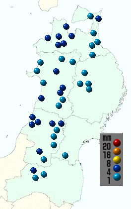 GotoHome Return Prev Next むつ 平均: 3.6℃ 最高: 6.2℃ 最低: 1.5℃ 小田野沢 平均: 4.5℃ 最高: 7.9℃ 最低: 1.2℃ 蟹田 平均: 3.7℃ 最高: 7.9℃ 最低: -2.4℃ 五所川原 平均: 2.3℃ 最高: 7.5℃ 最低: -4.4℃ 青森 平均: 3.9℃ 最高: 7.5℃ 最低: -0.1℃ 六ケ所 平均: 2.9℃ 最高: 7.2℃ 最低: -2.9℃ 鯵ケ沢 平均: 4.8℃ 最高: 8.3℃ 最低: 0.5℃ 弘前 平均: 2.3℃ 最高: 8.0℃ 最低: -4.2℃ 黒石 平均: 2.6℃ 最高: 6.3℃ 最低: -2.5℃ 三沢 平均: 4.4℃ 最高: 8.2℃ 最低: 0.1℃ 十和田 平均: 3.8℃ 最高: 8.2℃ 最低: -1.0℃ 八戸 平均: 4.9℃ 最高: 8.5℃ 最低: 0.3℃ 三戸 平均: 4.1℃ 最高: 9.0℃ 最低: -3.4℃ 能代 平均: 4.7℃ 最高: 7.7℃ 最低: -0.8℃ 大館 平均: 2.7℃ 最高: 7.5℃ 最低: -3.9℃ 鹿角 平均: 2.2℃ 最高: 6.3℃ 最低: -2.8℃ 大潟 平均: 4.0℃ 最高: 7.5℃ 最低: -3.0℃ 阿仁合 平均: 2.2℃ 最高: 6.2℃ 最低: -3.8℃ 秋田 平均: 5.0℃ 最高: 8.7℃ 最低: -1.4℃ 角館 平均: 2.0℃ 最高: 7.0℃ 最低: -2.8℃ 大曲 平均: 1.9℃ 最高: 6.7℃ 最低: -4.2℃ 本荘 平均: 5.2℃ 最高: 9.4℃ 最低: -1.3℃ 横手 平均: 3.0℃ 最高: 8.2℃ 最低: -3.8℃ 湯沢 平均: 2.6℃ 最高: 7.5℃ 最低: -3.4℃ 軽米 平均: 3.7℃ 最高: 6.9℃ 最低: 0.2℃ 久慈 平均: 3.1℃ 最高: 8.7℃ 最低: -4.1℃ 岩手松尾 平均: 0.7℃ 最高: 6.8℃ 最低: -8.1℃ 雫石 平均: 2.4℃ 最高: 7.8℃ 最低: -4.6℃ 盛岡 平均: 2.8℃ 最高: 7.9℃ 最低: -3.2℃ 宮古 平均: 4.7℃ 最高: 9.9℃ 最低: -3.1℃ 紫波 平均: 2.2℃ 最高: 7.0℃ 最低: -3.8℃ 遠野 平均: 2.7℃ 最高: 7.0℃ 最低: -3.8℃ 北上 平均: 3.5℃ 最高: 8.6℃ 最低: -3.0℃ 若柳 平均: 2.7℃ 最高: 8.4℃ 最低: -4.7℃ 江刺 平均: 3.4℃ 最高: 9.0℃ 最低: -3.5℃ 一関 平均: 3.5℃ 最高: 10.2℃ 最低: -4.1℃ 千厩 平均: 2.8℃ 最高: 8.8℃ 最低: -4.9℃ 築舘 平均: 2.7℃ 最高: 9.2℃ 最低: -5.3℃ 米山 平均: 3.7℃ 最高: 8.2℃ 最低: -3.5℃ 古川 平均: 4.1℃ 最高: 8.9℃ 最低: -1.7℃ 大衡 平均: 3.4℃ 最高: 10.2℃ 最低: -4.1℃ 鹿島台 平均: 2.6℃ 最高: 8.2℃ 最低: -6.4℃ 石巻 平均: 4.1℃ 最高: 6.1℃ 最低: -0.8℃ 仙台 平均: 4.7℃ 最高: 8.0℃ 最低: -1.2℃ 白石 平均: 4.9℃ 最高: 11.4℃ 最低: -3.4℃ 亘理 平均: 4.7℃ 最高: 8.4℃ 最低: -1.7℃ 酒田 平均: 5.9℃ 最高: 10.5℃ 最低: -0.1℃ 鶴岡 平均: 5.7℃ 最高: 10.5℃ 最低: 0.0℃ 狩川 平均: 4.3℃ 最高: 9.7℃ 最低: -1.9℃ 新庄 平均: 2.3℃ 最高: 7.9℃ 最低: -4.0℃ 向町 平均: 2.3℃ 最高: 7.5℃ 最低: -3.9℃ 尾花沢 平均: 1.2℃ 最高: 6.9℃ 最低: -6.8℃ 村山 平均: 1.6℃ 最高: 8.6℃ 最低: -7.4℃ 山形 平均: 3.2℃ 最高: 9.5℃ 最低: -3.9℃ 長井 平均: 2.0℃ 最高: 7.7℃ 最低: -5.5℃ 米沢 平均: 2.8℃ 最高: 8.3℃ 最低: -4.0℃ 福島 平均: 5.5℃ 最高: 11.2℃ 最低: -1.8℃ 相馬 平均: 4.8℃ 最高: 9.7℃ 最低: -4.0℃ 喜多方 平均: 1.0℃ 最高: 5.9℃ 最低: -6.1℃ 飯舘 平均: 3.4℃ 最高: 10.2℃ 最低: -4.8℃ 猪苗代 平均: 0.4℃ 最高: 5.4℃ 最低: -7.3℃ 二本松 平均: 4.7℃ 最高: 10.9℃ 最低: -3.8℃ 若松 平均: 1.9℃ 最高: 6.8℃ 最低: -3.9℃ 船引 平均: 3.8℃ 最高: 8.2℃ 最低: -1.8℃ 浪江 平均: 4.5℃ 最高: 8.7℃ 最低: -2.8℃ 郡山 平均: 4.8℃ 最高: 9.6℃ 最低: -2.1℃ 川内 平均: 4.4℃ 最高: 10.0℃ 最低: -2.9℃ 白河 平均: 3.2℃ 最高: 8.9℃ 最低: -4.7℃ 石川 平均: 3.3℃ 最高: 10.3℃ 最低: -3.7℃ 東白川 平均: 3.0℃ 最高: 10.2℃ 最低: -4.4℃ 小名浜 平均: 5.7℃ 最高: 8.4℃ 最低: 1.5℃ むつ : 5.8時間 小田野沢 : 5.9時間 蟹田 : 6.8時間 五所川原 : 7.7時間 青森 : 7.6時間 六ケ所 : 6.1時間 鯵ケ沢 : 8.3時間 弘前 : 5.4時間 黒石 : 5.8時間 三沢 : 4.6時間 十和田 : 4.3時間 八戸 : 5.0時間 三戸 : 3.2時間 能代 : 4.2時間 大館 : 3.9時間 鹿角 : 5.1時間 大潟 : 3.9時間 阿仁合 : 3.4時間 秋田 : 5.9時間 角館 : 6.6時間 大曲 : 6.1時間 本荘 : 6.7時間 横手 : 7.1時間 湯沢 : 7.2時間 軽米 : 5.1時間 久慈 : 4.8時間 岩手松尾 : 5.3時間 雫石 : 5.9時間 盛岡 : 7.7時間 宮古 : 5.3時間 紫波 : 6.8時間 遠野 : 6.0時間 北上 : 4.4時間 若柳 : 3.3時間 江刺 : 3.9時間 一関 : 4.3時間 千厩 : 4.7時間 築舘 : 3.4時間 米山 : 5.1時間 古川 : 3.9時間 大衡 : 3.0時間 鹿島台 : 3.9時間 石巻 : 4.7時間 仙台 : 4.6時間 白石 : 3.6時間 亘理 : 4.0時間 酒田 : 6.3時間 鶴岡 : 6.1時間 狩川 : 5.1時間 新庄 : 6.5時間 向町 : 5.1時間 尾花沢 : 4.1時間 村山 : 3.7時間 山形 : 3.6時間 長井 : 6.6時間 米沢 : 4.8時間 福島 : 3.8時間 相馬 : 3.5時間 喜多方 : 4.3時間 飯舘 : 3.6時間 猪苗代 : 3.6時間 二本松 : 2.9時間 若松 : 3.3時間 船引 : 6.1時間 浪江 : 5.0時間 郡山 : 5.0時間 川内 : 4.2時間 白河 : 4.4時間 石川 : 4.6時間 東白川 : 1.9時間 小名浜 : 2.6時間 むつ : 3.5mm 小田野沢 : 5.5mm 蟹田 : 5.5mm 五所川原 : 6.5mm 青森 : 5.5mm 六ケ所 : 1.5mm 鯵ケ沢 : 6.5mm 弘前 : 6.5mm 黒石 : 6.0mm 三沢 : 0.5mm 十和田 : 1.0mm 八戸 : 0.0mm 三戸 : 1.0mm 能代 : 1.5mm 大館 : 2.5mm 鹿角 : 1.5mm 大潟 : 2.0mm 阿仁合 : 5.0mm 秋田 : 2.0mm 角館 : 4.5mm 大曲 : 4.0mm 本荘 : 4.5mm 横手 : 2.0mm 湯沢 : 2.0mm 軽米 : 0.0mm 久慈 : 0.0mm 岩手松尾 : 1.0mm 雫石 : 3.5mm 盛岡 : 1.5mm 宮古 : 0.0mm 紫波 : 0.5mm 遠野 : 0.0mm 北上 : 0.0mm 若柳 : 0.0mm 江刺 : 0.0mm 一関 : 0.0mm 千厩 : 0.0mm 築舘 : 0.0mm 米山 : 0.0mm 古川 : 0.0mm 大衡 : 0.0mm 鹿島台 : 0.0mm 石巻 : 0.0mm 仙台 : 0.0mm 白石 : 0.5mm 亘理 : 0.0mm 酒田 : 4.5mm 鶴岡 : 6.0mm 狩