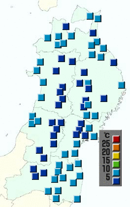 GotoHome Return Prev Next むつ 平均: 5.4℃ 最高: 9.2℃ 最低: 0.5℃ 小田野沢 平均: 6.0℃ 最高: 9.7℃ 最低: -0.8℃ 蟹田 平均: 2.3℃ 最高: 8.8℃ 最低: -2.6℃ 五所川原 平均: 5.9℃ 最高: 12.3℃ 最低: 0.7℃ 青森 平均: 5.2℃ 最高: 11.9℃ 最低: -0.4℃ 六ケ所 平均: 4.7℃ 最高: 9.0℃ 最低: -0.7℃ 鯵ケ沢 平均: 6.0℃ 最高: 11.6℃ 最低: -0.5℃ 弘前 平均: 5.3℃ 最高: 12.2℃ 最低: -0.8℃ 黒石 平均: 6.4℃ 最高: 12.1℃ 最低: 2.7℃ 三沢 平均: 7.4℃ 最高: 13.0℃ 最低: 2.6℃ 十和田 平均: 6.2℃ 最高: 12.8℃ 最低: 0.6℃ 八戸 平均: 8.0℃ 最高: 13.3℃ 最低: 1.5℃ 三戸 平均: 6.4℃ 最高: 13.7℃ 最低: -0.9℃ 能代 平均: 6.3℃ 最高: 12.7℃ 最低: 0.9℃ 大館 平均: 4.3℃ 最高: 12.2℃ 最低: -2.3℃ 鹿角 平均: 3.2℃ 最高: 10.5℃ 最低: -2.8℃ 大潟 平均: 6.9℃ 最高: 12.0℃ 最低: -0.7℃ 阿仁合 平均: 4.0℃ 最高: 10.7℃ 最低: -0.1℃ 秋田 平均: 7.1℃ 最高: 12.6℃ 最低: 1.4℃ 角館 平均: 3.3℃ 最高: 9.2℃ 最低: -2.3℃ 大曲 平均: 2.6℃ 最高: 7.5℃ 最低: -3.4℃ 本荘 平均: 6.3℃ 最高: 13.9℃ 最低: -0.7℃ 横手 平均: 3.6℃ 最高: 8.8℃ 最低: -2.4℃ 湯沢 平均: 2.3℃ 最高: 8.0℃ 最低: -3.8℃ 軽米 平均: 5.4℃ 最高: 12.2℃ 最低: -2.0℃ 久慈 平均: 4.8℃ 最高: 9.9℃ 最低: -1.1℃ 岩手松尾 平均: 4.0℃ 最高: 9.0℃ 最低: -1.8℃ 雫石 平均: 2.4℃ 最高: 8.6℃ 最低: -4.2℃ 盛岡 平均: 5.0℃ 最高: 10.2℃ 最低: -1.3℃ 宮古 平均: 8.1℃ 最高: 15.2℃ 最低: 1.8℃ 紫波 平均: 4.5℃ 最高: 9.4℃ 最低: -1.2℃ 遠野 平均: 4.3℃ 最高: 12.3℃ 最低: -2.8℃ 北上 平均: 4.7℃ 最高: 10.8℃ 最低: -1.8℃ 若柳 平均: 4.5℃ 最高: 12.0℃ 最低: -1.7℃ 江刺 平均: 5.1℃ 最高: 12.7℃ 最低: -2.1℃ 一関 平均: 5.9℃ 最高: 12.6℃ 最低: -1.8℃ 千厩 平均: 6.1℃ 最高: 13.0℃ 最低: -2.5℃ 築舘 平均: 4.9℃ 最高: 11.8℃ 最低: -3.2℃ 米山 平均: 5.5℃ 最高: 12.8℃ 最低: -2.5℃ 古川 平均: 4.6℃ 最高: 11.9℃ 最低: -2.9℃ 大衡 平均: 4.5℃ 最高: 11.8℃ 最低: -3.6℃ 鹿島台 平均: 4.5℃ 最高: 11.9℃ 最低: -5.0℃ 石巻 平均: 6.9℃ 最高: 9.6℃ 最低: 2.7℃ 仙台 平均: 6.1℃ 最高: 10.0℃ 最低: 1.1℃ 白石 平均: 5.6℃ 最高: 12.6℃ 最低: -1.7℃ 亘理 平均: 6.1℃ 最高: 9.5℃ 最低: 1.3℃ 酒田 平均: 8.1℃ 最高: 14.4℃ 最低: 2.6℃ 鶴岡 平均: 7.2℃ 最高: 14.0℃ 最低: -0.4℃ 狩川 平均: 6.2℃ 最高: 9.9℃ 最低: 3.3℃ 新庄 平均: 1.8℃ 最高: 7.1℃ 最低: -3.7℃ 向町 平均: 2.2℃ 最高: 9.5℃ 最低: -4.5℃ 尾花沢 平均: 1.9℃ 最高: 7.3℃ 最低: -4.3℃ 村山 平均: 2.1℃ 最高: 7.2℃ 最低: -3.5℃ 山形 平均: 4.2℃ 最高: 9.7℃ 最低: -1.2℃ 長井 平均: 0.8℃ 最高: 6.1℃ 最低: -4.8℃ 米沢 平均: 2.6℃ 最高: 8.2℃ 最低: -2.9℃ 福島 平均: 7.4℃ 最高: 14.9℃ 最低: 0.9℃ 相馬 平均: 5.2℃ 最高: 8.9℃ 最低: -2.2℃ 喜多方 平均: 1.7℃ 最高: 8.3℃ 最低: -4.2℃ 飯舘 平均: 7.5℃ 最高: 12.6℃ 最低: -1.4℃ 猪苗代 平均: 3.2℃ 最高: 9.0℃ 最低: -2.4℃ 二本松 平均: 7.3℃ 最高: 13.8℃ 最低: 0.0℃ 若松 平均: 3.6℃ 最高: 9.1℃ 最低: -1.9℃ 船引 平均: 7.4℃ 最高: 12.3℃ 最低: 0.6℃ 浪江 平均: 8.3℃ 最高: 14.5℃ 最低: -0.4℃ 郡山 平均: 7.0℃ 最高: 13.1℃ 最低: -0.9℃ 川内 平均: 8.1℃ 最高: 13.0℃ 最低: 0.7℃ 白河 平均: 7.5℃ 最高: 12.3℃ 最低: 1.5℃ 石川 平均: 7.5℃ 最高: 12.8℃ 最低: -1.0℃ 東白川 平均: 7.5℃ 最高: 12.8℃ 最低: -1.5℃ 小名浜 平均: 8.0℃ 最高: 11.1℃ 最低: 2.9℃ むつ : 2.0時間 小田野沢 : 1.0時間 蟹田 : 2.2時間 五所川原 : 0.9時間 青森 : 1.7時間 六ケ所 : 1.5時間 鯵ケ沢 : 1.0時間 弘前 : 1.1時間 黒石 : 1.2時間 三沢 : 0.1時間 十和田 : 1.0時間 八戸 : 0.0時間 三戸 : 0.7時間 能代 : 0.0時間 大館 : 1.1時間 鹿角 : 2.7時間 大潟 : 0.1時間 阿仁合 : 1.1時間 秋田 : 0.1時間 角館 : 1.4時間 大曲 : 0.5時間 本荘 : 0.5時間 横手 : 0.3時間 湯沢 : 0.0時間 軽米 : 0.0時間 久慈 : 0.0時間 岩手松尾 : 2.7時間 雫石 : 2.3時間 盛岡 : 2.8時間 宮古 : 1.2時間 紫波 : 1.6時間 遠野 : 2.7時間 北上 : 0.8時間 若柳 : 1.1時間 江刺 : 1.4時間 一関 : 1.4時間 千厩 : 1.8時間 築舘 : 0.1時間 米山 : 2.0時間 古川 : 0.8時間 大衡 : 0.4時間 鹿島台 : 0.5時間 石巻 : 0.5時間 仙台 : 0.2時間 白石 : 0.0時間 亘理 : 0.0時間 酒田 : 1.0時間 鶴岡 : 0.4時間 狩川 : 0.3時間 新庄 : 1.1時間 向町 : 0.8時間 尾花沢 : 0.4時間 村山 : 0.1時間 山形 : 0.3時間 長井 : 0.5時間 米沢 : 0.0時間 福島 : 0.0時間 相馬 : 0.1時間 喜多方 : 0.2時間 飯舘 : 0.1時間 猪苗代 : 0.1時間 二本松 : 0.0時間 若松 : 0.7時間 船引 : 1.0時間 浪江 : 0.4時間 郡山 : 0.5時間 川内 : 0.5時間 白河 : 0.9時間 石川 : 0.5時間 東白川 : 0.0時間 小名浜 : 0.4時間 むつ : 0.0mm 小田野沢 : 0.5mm 蟹田 : 0.5mm 五所川原 : 0.0mm 青森 : 0.0mm 六ケ所 : 0.0mm 鯵ケ沢 : 0.0mm 弘前 : 0.0mm 黒石 : 0.0mm 三沢 : 0.0mm 十和田 : 0.0mm 八戸 : 0.0mm 三戸 : 0.0mm 能代 : 0.5mm 大館 : 0.0mm 鹿角 : 0.0mm 大潟 : 1.0mm 阿仁合 : 0.0mm 秋田 : 1.5mm 角館 : 2.5mm 大曲 : 2.0mm 本荘 : 3.5mm 横手 : 1.5mm 湯沢 : 0.0mm 軽米 : 0.0mm 久慈 : 0.0mm 岩手松尾 : 0.0mm 雫石 : 0.5mm 盛岡 : 1.0mm 宮古 : 0.0mm 紫波 : 1.5mm 遠野 : 5.5mm 北上 : 1.0mm 若柳 : 0.5mm 江刺 : 1.0mm 一関 : 2.0mm 千厩 : 5.0mm 築舘 : 2.0mm 米山 : 2.0mm 古川 : 0.5mm 大衡 : 0.5mm 鹿島台 : 0.5mm 石巻 : 2.0mm 仙台 : 0.5mm 白石 : 3.0mm 亘理 : 1.5mm 酒田 : 2.5