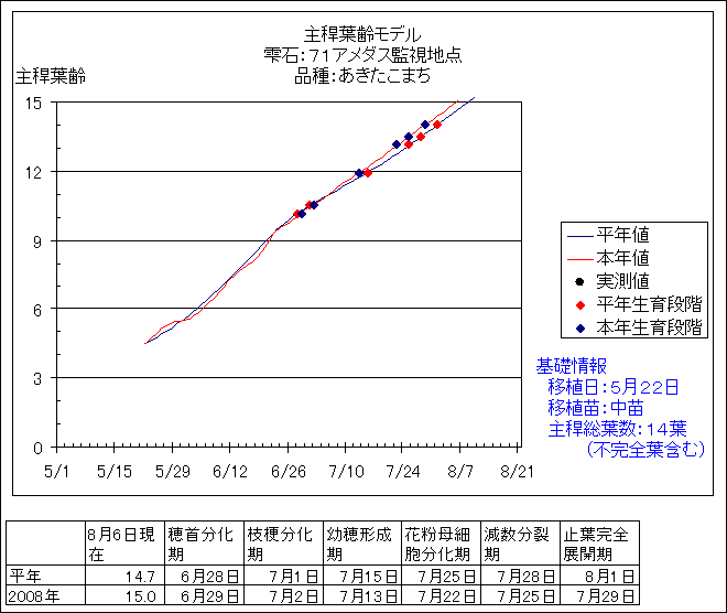 | 秋田県阿仁合 | あきたこまち | <葉齢進度予測編> | ・ | <穂の発育予測編> | ・ | <玄米の発育予測編> |