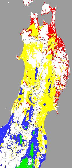 左図は平均気温の過去7日間平均値を水田分布メッシュ対象で示したものです。田植えの可否の参考にするために作成しました。 なお、気温区分には下の基準温度を参考にしました。 ○苗の活着限界気温:13度 ○活着期の冷温障害限界気温:11度 | ||||||||||||