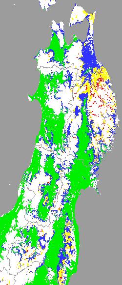 左図は8月中旬に出穂した水稲の登熟期間(出穂・開花後40日間)の温度条件を追跡するために、8月20日からの平均気温の平均値を水田分布メッシュ対象(白色の部分は対象外)に示したものです。登熟遅延を監視するために作成しています。 |