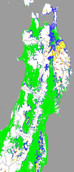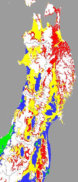 左図は、8月15日に出穂期にあった水稲を対象に、出穂後の積算平均気温を水田分布メッシュ対象(白色の部分は対象外)で示したものです。刈り取り時期の判定の参考にしてください。 |