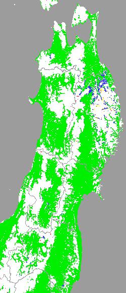 右図は、8月15日に出穂期にあった水稲を対象に、出穂後の積算平均気温を水田分布メッシュ対象(白色の部分は対象外)で示したものです。刈り取り時期の判定の参考にしてください。 | ||||||||||||
