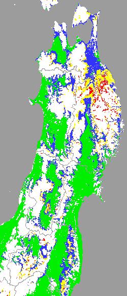 右図は、8月20日に出穂期にあった水稲を対象に、出穂後の積算平均気温を水田分布メッシュ対象(白色の部分は対象外)で示したものです。刈り取り時期の判定の参考にしてください。 |