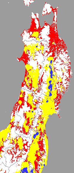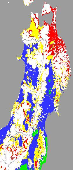 | 警戒メッシュ説明: 上図は平均・最高・最低気温の過去7日間平均値を水田分布メッシュ対象で示したものです。育苗管理や田植え時期の判定等の参考にして下さい。 なお、気温区分には下の基準温度等を参考にしています。 ○稚苗移植の早限を示す平均気温:13度 ○ 晩霜の目安となる最低気温:4度 ○ 他の区分温度は、東北全域の気温推移を把握するために設定しています。 | ||||||||||||||||||||||||||||||||||||||