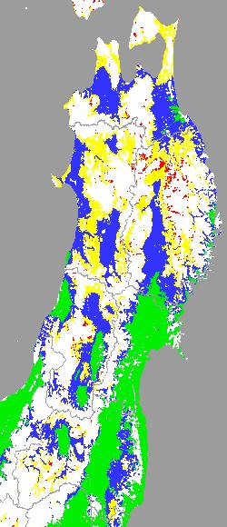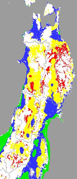 警戒メッシュ説明: 上図は平均・最高・最低気温の過去7日間平均値を水田分布メッシュ対象で示したものです。育苗管理や田植え時期の判定等の参考にして下さい。 なお、気温区分には下の基準温度等を参考にしています。 ○稚苗移植の早限を示す平均気温:13度 ○ 晩霜の目安となる最低気温:4度 ○ 他の区分温度は、東北全域の気温推移を把握するために設定しています。 | ||||||||||||||||||||||||||||||||||||||