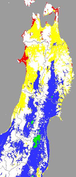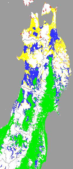 警戒メッシュ説明: 上図は平均・最高・最低気温の過去7日間平均値を水田分布メッシュ対象で示したものです。育苗管理や田植え時期の判定等の参考にして下さい。 なお、気温区分には下の基準温度等を参考にしています。 ○稚苗移植の早限を示す平均気温:13度 ○ 晩霜の目安となる最低気温:4度 ○ 他の区分温度は、東北全域の気温推移を把握するために設定しています。 | ||||||||||||||||||||||||||||||||||||||