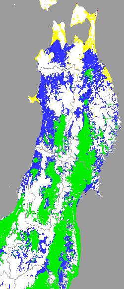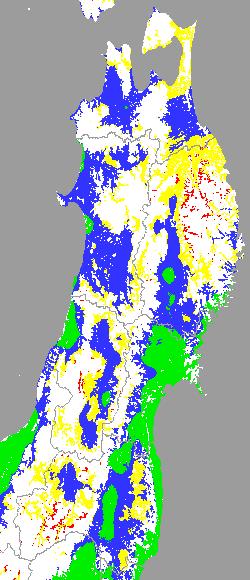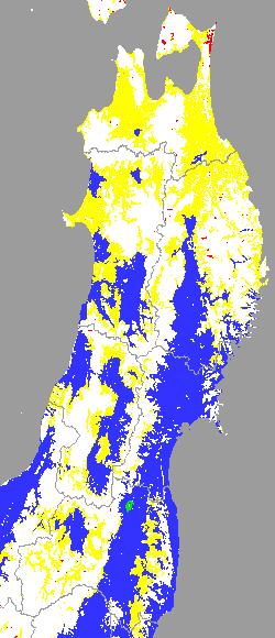警戒メッシュ説明: 上図は平均・最高・最低気温の過去7日間平均値を水田分布メッシュ対象で示したものです。田植え時期の判定や本田の水管理等の参考にして下さい。 なお、気温区分には下の基準温度等を参考にしています。 ○ 中苗・成苗田植えの早限を示す平均気温:14度 ○ 生長点における葉の形成を抑制する温度:10〜11度 ○ 他の区分温度は、東北全域の気温推移を把握するために設定しています。 | ||||||||||||||||||||||||||||||||||||||