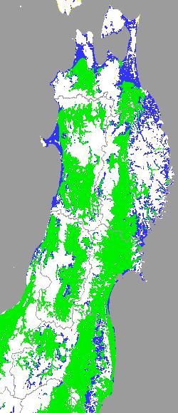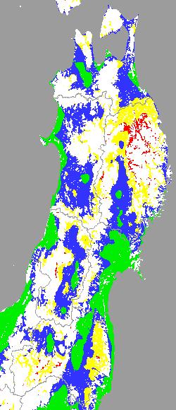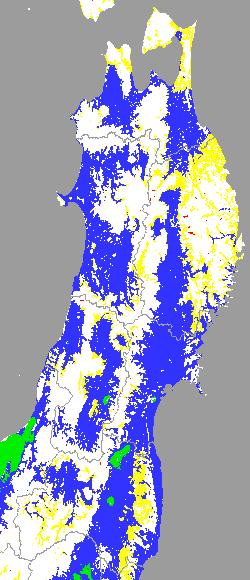 警戒メッシュ説明: 上図は平均・最高・最低気温の過去7日間平均値を水田分布メッシュ対象で示したものです。生育を促進するための水管理等の参考にして下さい。 なお、気温区分には下の基準温度等を参考にしています。 ○ 冷温の障害が懸念される平均気温(要深水管理):13度以下 ○ 生育促進のため水管理に注意が必要な平均温度:13〜16度 ○ 他の区分温度は、東北全域の気温推移を把握するために設定しています。 ○ 最高と最低気温は日較差を把握するためで、日較差が大きいほど分げつ形成に有利といわれています。 ○ 最高と最低気温は日較差を把握するためで、日較差が大きいほど分げつ形成に有利といわれています。 | ||||||||||||||||||||||||||||||||||||||
