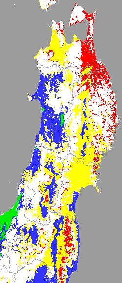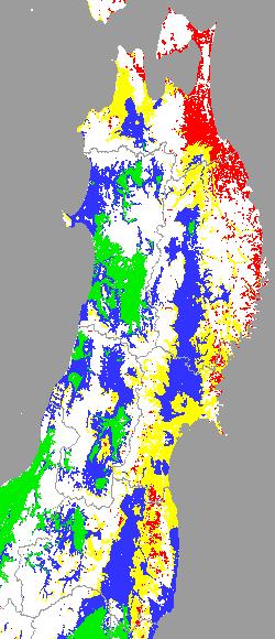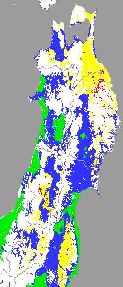 警戒メッシュ説明: 上図は平均・最高・最低気温の過去7日間平均値を水田分布メッシュ対象で示したものです。低温障害の回避と生育促進のための水管理・肥培管理の参考にして下さい。 なお、気温区分には下の基準温度等を参考にしています。 ○ 低温障害が懸念される平均気温(要前歴・危険期深水管理):17度以下 ○ 生育促進のため水管理に注意が必要な平均気温(要前歴・危険期深水管理):19度 | ||||||||||||||||||||||||||||||||||||||