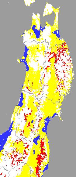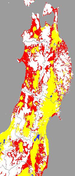 現在、東北地域の水稲の生育は減数分裂期前後にあり、作柄やいもち病の発生を左右する最も重要な発育段階にあります。 過去7日間の地帯別平均的気象経過は上表の通りです。気温は平年よりかなり高く推移しています。今までの気象と生育経過をみると、太平洋側の地帯においては生育の進み方が平年よりかなり早くなっているものと推察されます。そのため、栽培管理に当たってはこの点を十分考慮して下さい。 今後の天候推移(上図の警戒メッシュ)と南海上の熱帯性低気圧の動きには注意を払い、また各県の稲作技術・予察情報ならびにホームページの『図説:水管理』『生育・作柄情報』−『発育予測情報』『葉いもち予察情報』頁などを参考にして、適正な水管理、葉いもちの早期発見・早期防除、適正な追肥を実施して下さい。 <天気がぐずつく場合> ● 葉いもちの早期発見と早期防除 ● 穂いもち防除の徹底 <高温時> ●根の活力維持のために間断灌漑 <低温時> ○幼穂形成期前後にある水稲:前歴深水(10cm程度)管理の実施。 ○危険期に近づくつつある水稲:危険期深水(可能な範囲で。できれば18cm〜20cm程度)管理の実施。 | ||||||||||||||||||||||||||||||||||||||