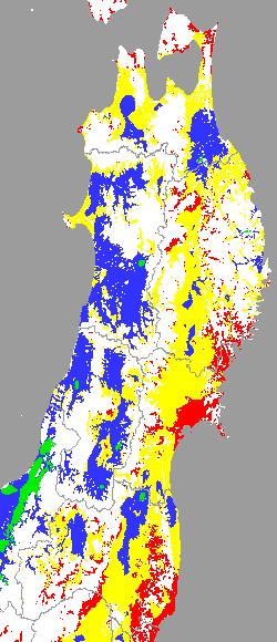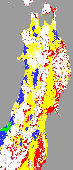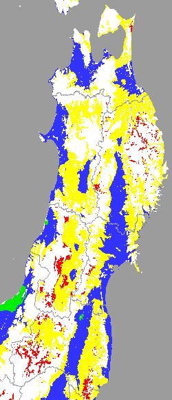警戒メッシュ説明: 上図は平均・最高・最低気温の過去7日間平均値を水田分布メッシュ対象で示したものです。高温障害回避のための水管理の参考にして下さい。 なお、気温区分には下の基準温度等を参考にしています。 ○ 高温障害に注意が必要な最高気温:35度以上 ○ 平均(30度)と最低気温(25度)については、高温の程度を把握できるように区分した。 注)図の色分けは冷害対応となっているため、低温側が“赤”、高温側が“緑”となっています。そのため、緑の地帯が警戒の必要なことを示します。 | ||||||||||||||||||||||||||||||||||||||