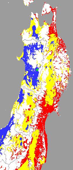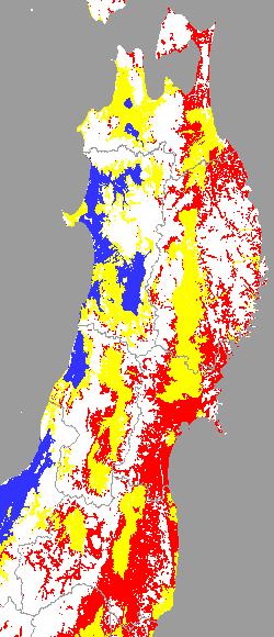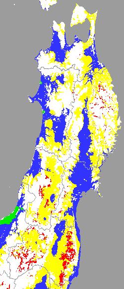 現在、東北地域の水稲の生育は出穂・開花・受精期から乳熟始めにあり、作柄を左右する最も重要な発育段階にあります。 過去7日間の地帯別平均的気象経過は上表の通りです。気温は特に日本海側の地帯3と5では著しく高く、また降水量は全般に少なく推移しています。高温によっても障害不稔が発生します。最も敏感な時期は開花・受精期で、次いで穂ばらみ期です。(低温の場合とは順位が逆転します。) また、乳熟期から糊熟期の期間に著しい高温に遭遇すると、小粒化や乳白・腹白・心白・背白・基白粒などが多発し玄米の粒質が著しく低下することがあります。このことは、平成6年度に一等米比率が著しく低下したという苦い経験を思い起こして下さい。 今後は日本海側を中心に著しい高温(上図の警戒メッシュ)やフェーン現象の発生等に特に警戒し、また各県の稲作技術・予察情報ならびにホームページの『図説:水管理』『生育・作柄情報』−『発育予測情報(穂の発育編)』頁などを参考にして、適正な水管理と用水の確保ならびに穂いもち防除を徹底して下さい。 <著しい高温の場合> ● 常時深水で湛水。可能ならば掛け流し灌漑による水田・稲体温度環境の制御 ● 灌漑用水の確保と計画的利用 <高温時> ●根の活力維持のための間断灌漑 | ||||||||||||||||||||||||||||||||||||||