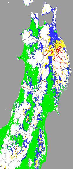 | 現在、東北地域の水稲は成熟直前から収穫期にあります。適期に刈り取るか否かで、玄米の品質が大きく左右される最終段階に来ています。過去7日間の地帯別平均的気象経過は上表の通りです。気温は平年よりかなり高く、降水量も多く推移してきました。 ほとんどの地帯では刈り取り適期に入っています。今後は曇雨天が続き、気温の高い状態もさらに続く見込みです。各県の技術情報、圃場の籾の黄化程度と出穂後の積算平均気温を示した警戒メッシュ図などを参考にして、適期刈り取りを徹底して下さい。 |