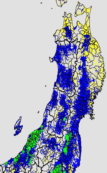 | 右図は平均気温の過去7日間平均値を水田分布メッシュ対象で示したものです。水管理等の参考にして下さい。 なお、平均気温区分には次の基準温度を参考にしています。 ○冷温障害要注意:13度以下 ○水管理要注意(保温的水管理):16度以下 ○葉いもち注意:19度以上 | ||||||||||||