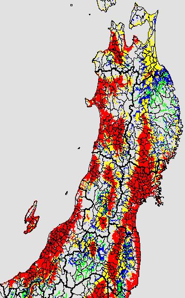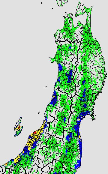 警戒メッシュ説明: 右図は最低気温の過去5日間平均値を水田分布メッシュ対象で示したものです。栽培管理等の参考にして下さい。 なお、最低気温区分には次の基準温度を参考にしています。 ○高温障害に警戒が必要:24度以上 ○高温障害に注意が必要:23度〜24度 |