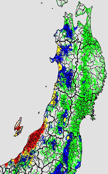 警戒メッシュ説明: 右図は最低気温の過去5日間平均値を水田分布メッシュ対象で示したものです。栽培管理等の参考にして下さい。 なお、最低気温区分には次の基準温度を参考にしています。 ○高温障害に警戒が必要:24度以上 ○高温障害に注意が必要:23度〜24度 |