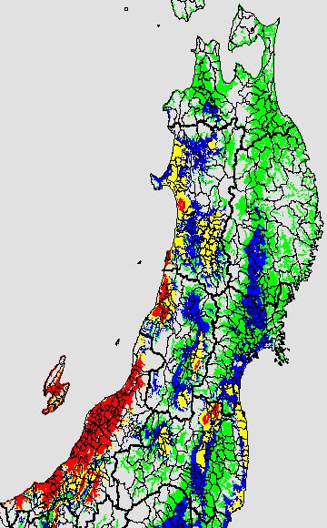 | 現在、東北地域の水稲は糊熟期〜成熟期直前にあります。 過去7日間の地帯別平均的気象経過は上表の通りです。気温は全般的に高く、日照時間は概ね平年よりやや多く推移しています。今後は太平洋高気圧が張り出し、平均気温は高いと予想されます。 アメダス監視地点、モニター圃場や盛岡の穂の発育予測図からみると、太平洋側を中心に生育が7〜14日程度早くなっています。早い稲は成熟期を迎えようとしています。また多くの稲は糊熟期から黄熟期の間にあります。各県の技術・予察情報、図説(高温障害編)の情報ならびに高温障害警戒メッシュ図と発育予測などを参考にして、生育がかなり進んでいることを十分に考慮して適切な水管理を実施して下さい。また8月末から9月上旬に成熟期に達するものも多いと予想されます。収穫準備は早めに取り掛かり、適期に刈り取るようにして下さい。 ○間断灌漑で根の活力を維持し、稲体の健全性を保持する。 ○適期落水の実施。 |