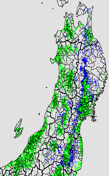 | 警戒メッシュ説明: 右図は平均気温の過去7日間平均値で低温被害を監視する目的で、水田分布メッシュを対象に示したものです。前歴・危険期深水管理等の栽培管理の参考にして下さい。なお、警戒メッシュは、平均気温前7日間の移動平均を用いて下の基準温度を使用しています。(詳細は気象障害監視のポイントを参照。) @平均気温17℃以下:かなりの被害が予想される。 A平均気温17℃〜19℃:生育遅延が予想される。 B平均気温19〜21℃:生育遅延が心配される。 C平均気温21℃以上:生育遅延は予想されない。 <特記事項> ・宮城県(7月7日):斑点米カメムシ類に関する注意報が出されています。 ・岩手県(7月15日):穂いもちに関する注意報が出されています。 ・秋田県(7月14日):アカヒゲホソミドリカスミカメによる斑点米の注意報が出されています。 ・秋田県(7月15日):いもち病緊急情報が出されています。 ・福島県(7月15日):イネ斑点米カメムシ類の注意報が出されています。 ・宮城県(7月23日):穂いもちに関する注意報が出されています。 ・山形県(7月23日):穂いもちに関する注意報が出されています。 ・秋田県(7月23日):穂いもちに関する警報が出されています。 ・岩手県(7月28日):穂いもちに関する注意報が出されています。 ・宮城県(7月28日):斑点米カメムシ類に関する警報が出されています。 ・青森県(7月29日):穂いもちに関する注意報が出されています。 ・青森県(7月30日):斑点米カメムシに関する注意報が出されています。 ・山形県(8月4日):斑点米カメムシ類に関する注意報が出されています。 ・岩手県(8月5日):カメムシ類(斑点米の原因となるカスミカメムシ類)に関する警報が出されています。 ・栽培管理上参考にすべき各種気象情報については、仙台管区気象台ホームページの「気象情報発表」コーナー(http://www.sendai-jma.go.jp/)を参照ください。 | ![]() | ||||||||||||