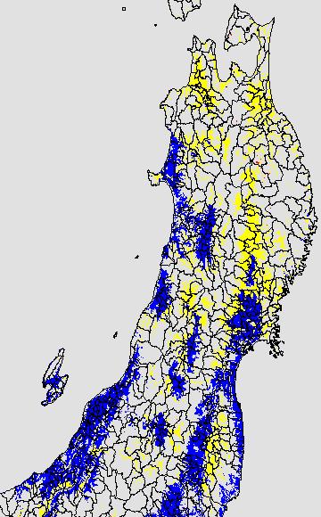| 警戒メッシュ説明: 右図は平均気温の過去7日間平均値で活着障害を監視する目的で、水田分布メッシュを対象に示したものです。育苗管理や田植え時期の判定等の参考にして下さい。なお、警戒メッシュは下の基準温度を使用しています。(詳細は気象障害監視のポイントを参照。) 基準気温 障害の程度 @9℃以下 生育が著しく抑制される。 A12℃以下 生育の遅れが懸念される。 B15℃以下 活着は普通に進む。 C15℃以上 活着とその後の生育は急速に進む。 <特記事項> ・栽培管理上参考にすべき各種気象情報については、仙台管区気象台ホームページの「気象情報発表」コーナー(http://www.sendai-jma.go.jp/)を参照ください。 | ![]() | ||||||||||||