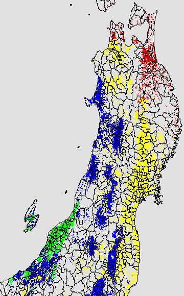 | 警戒メッシュ説明: 右図は平均気温の過去7日間平均値で低温被害を監視する目的で、水田分布メッシュを対象に示したものです。前歴・危険期深水管理等の栽培管理の参考にして下さい。なお、警戒メッシュは、平均気温前7日間の移動平均を用いて下の基準温度を使用しています。(詳細は気象障害監視のポイントを参照。) 基準気温 障害の程度 @平均気温17℃以下(赤):かなりの被害が予想されるため深水管理を実施する。 A平均気温17℃〜20℃(黄):耐冷性の弱い品種などでは被害が予想されるため、深水管理を実施する。 B平均気温20〜22℃(青):予防的な深水管理の実施を検討する。 C平均気温22℃以上(緑):被害は予想されない。 <特記事項> ・中干しは幼穂形成期前までに終えること。 ・東北南部は6月15日に、また北部は6月27日に入梅となり、またいもち病の蔓延可能域は全域に広がってます。 ・栽培管理上参考にすべき各種気象情報については、仙台管区気象台ホームページの「気象情報発表」コーナー(http://www.sendai-jma.go.jp/)を参照ください。 | ![]() | ||||||||||||