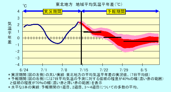 | <特に注意を要する事項> 東北地方では日照時間の少ない状況が続いています。期間の前半を中心に平年に比べて雨の日が多く日照時間が少ない見込みです。農作物の管理などに注意してください。 |