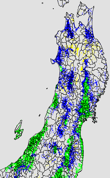 | 警戒メッシュ説明: 右図は平均気温の過去7日間平均値で低温被害を監視する目的で、水田分布メッシュを対象に示したものです。深水管理等の栽培管理の参考にして下さい。なお、警戒メッシュは平均気温前7日間の移動平均値を用いて下の基準温度で図示しています。(詳細は気象障害監視のポイントを参照。) 基準気温 障害の程度 @平均気温17℃以下:かなりの生育遅延が予想される。 A平均気温17℃〜19℃:生育遅延が懸念される。 B平均気温19〜21℃:生育遅延が心配される。 C平均気温21℃以上:生育遅延は予想されない。 <特記事項> ・宮城県(23日付け)で斑点米カメムシに関する注意報が発令されています。 ・青森県(31日付け)で斑点米カメムシに関する注意報が発令されています。 ・福島県(1日付け)で斑点米カメムシに関する注意報が発令されています。 ・岩手県(8日付け)で斑点米カメムシに関する注意報が発令されています。 ・山形県(8日付け)で斑点米カメムシに関する注意報が発令されています。 ・山形県(30日付け)で穂いもちに関する注意報が発令されています。 ・福島県(1日付け)で穂いもちに関する注意報が発令されています。 ・栽培管理上参考にすべき各種気象情報については、仙台管区気象台ホームページの「気象情報発表」コーナー(http://www.sendai-jma.go.jp/)を参照ください。 | ![]() | ||||||||||||