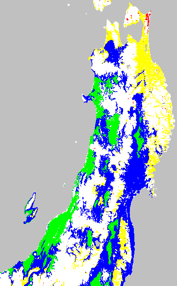右図は平均気温の過去7日間平均値で活着障害を監視する目的で、水田分布メッシュを対象に示したものです。育苗管理や田植え時期の判定等の参考にして下さい。なお、警戒メッシュは下の基準温度を使用しています。(詳細は気象障害監視のポイントを参照。)