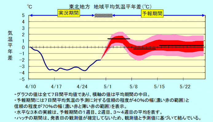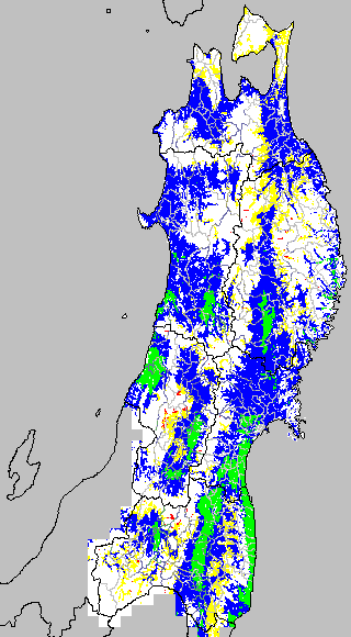 右図は平均気温の過去7日間平均値で活着障害を監視する目的で、水田分布メッシュを対象に示したものです。育苗管理や田植え時期の判定等の参考にして下さい。なお、警戒メッシュは下の基準温度を使用しています。(詳細は気象障害監視のポイントを参照。)