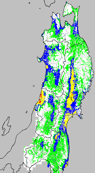 警戒メッシュ説明: 右図は最低気温の過去5日間平均値を水田分布メッシュ対象で示したものです。栽培管理等の参考にして下さい。 なお、最低気温区分には次の基準温度を参考にしています。 ○高温障害に警戒が必要:24度以上 ○高温障害に注意が必要:23度〜24度 |