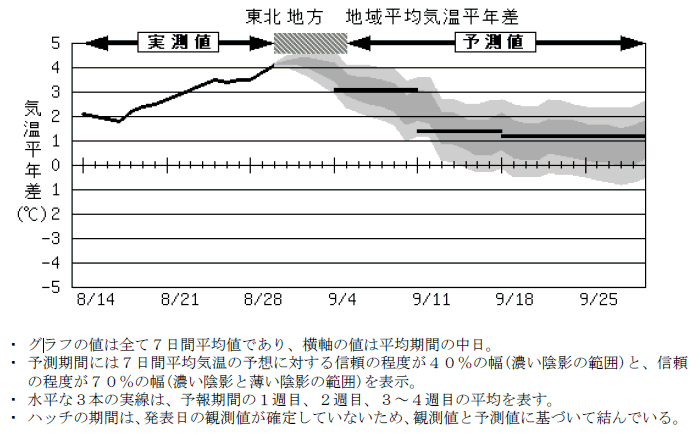 <特記事項> ・岩手県(8月5日)から「農作物技術情報 号外 高温対策」が発表されています。 ・岩手県(8月10日)からカメムシに関する「病害虫防除速報水稲編No.5」が発表されています。 ・秋田県(8月26日)からカメムシに関する発生予察注意報第3号が発表されています。 ・山形県(8月6日)からカメムシに関する発生予察注意報第1号が発表されています。 ・山形県(8月10日)から「高温と少雨に対応した農作物等の技術対策の徹底について」が発表されています。 ・福島県(8月10日)から「高温条件下における農作物等の技術対策」が発表されています。 ・福島県(8月12日)からカメムシに関する発生予察注意報第3号が発表されています。 ・仙台管区気象台(8月20日)から「長期間の高温と少雨に関する東北地方気象情報 第2号」が発表されています。 ・栽培管理上参考にすべき各種気象情報については、仙台管区気象台ホームページの「気象情報発表」「異常天候早期警戒情報」(http://www.jma-net.go.jp/sendai/)を参照ください。 | ||||||||||||