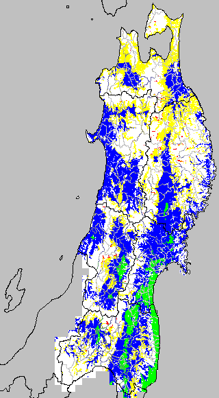 | 警戒メッシュ説明: 右図は平均気温の過去7日間平均値で活着障害を監視する目的で、水田分布メッシュを対象に示したものです。育苗管理や田植え時期の判定等の参考にして下さい。なお、警戒メッシュは下の基準温度を使用しています。(詳細は気象障害監視のポイントを参照。) 基準気温 障害の程度 @9℃以下 生育が著しく抑制される。 A12℃以下 生育の遅れが懸念される。 B15℃以下 活着は普通に進む。 C15℃以上 活着とその後の生育は急速に進む。 <特記事項> ・東日本大震災の被災地域等においては、農地・農業水利施設の被害などにより、通常の作期より遅く田植えを行わざるを得ない地域もあると思います。参考にしていただくため、水稲の移植晩限をつくばの機関と共同で推定しています。ただし、各県が指導する移植適期より遅くなりますと減収の危険もありますので、注意して下さい。また、水稲の晩植栽培における一般的な留意点が作物研究所より示されています。あわせて参考にして下さい。 水稲の移植栽培における晩限日の推定について(農業・食品産業技術総合研究機構、農業環境技術研究所) 水稲の晩植栽培における技術的留意点(作物研究所) | ![]() | ||||||||||||